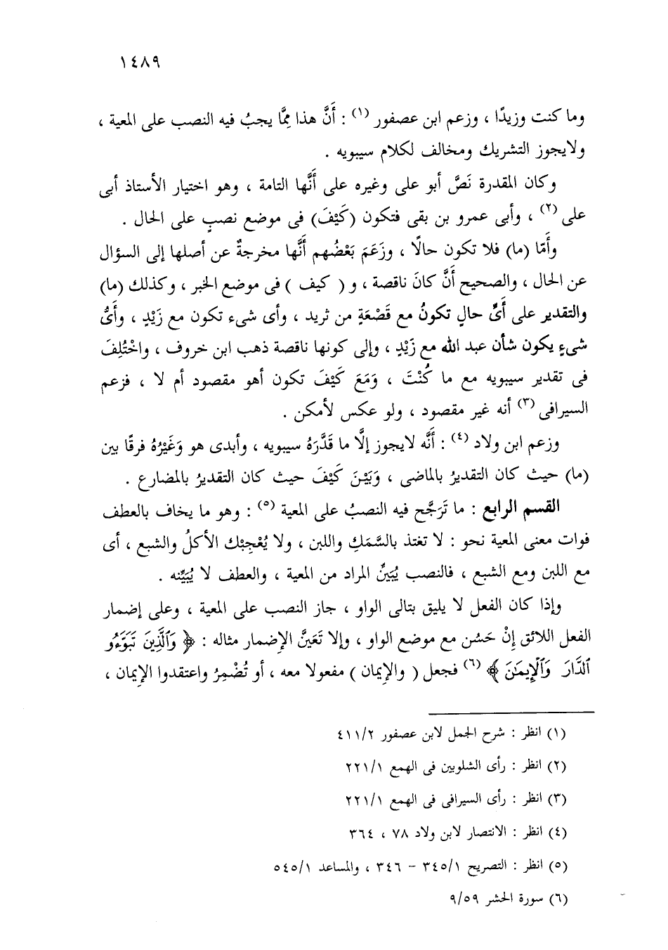 القسم الرابع: ما ترجح فيه النصب على المعية: وهو ما يخاف بالعطف فوات معنى المعية نحو: لا تغتذ بالسمك واللبن، ولا يعجبك الأكل والشبع، أي مع اللبن ومع الشبع، فالنصب يبين المراد من المعية، والعطف لا يبينه.