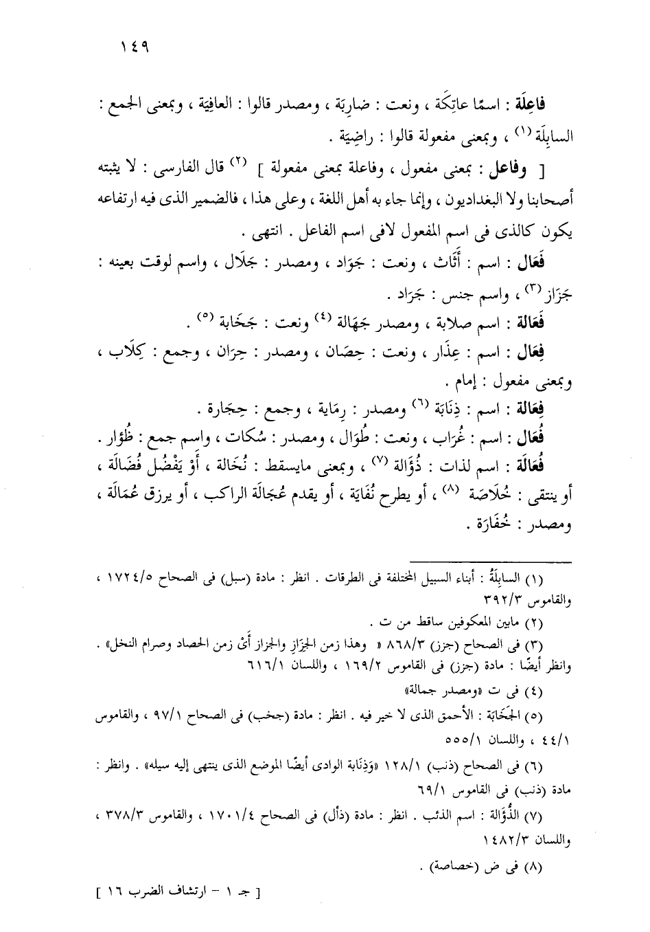 فعال: اسم: عذار، ونعت: حصان، ومصدر: حران، وجمع: كلاب، وبمعنى مفعول: إمام.