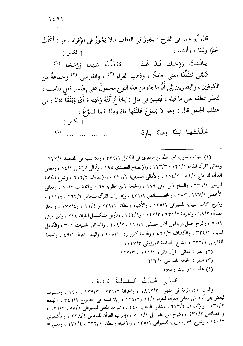 ضمن متقلدًا معنى حاملاً، وذهب الفراء، والفارسي وجماعة من الكوفيين، والبصريين إلى أن ما جاء من هذا النوع محمول على إضمار فعل مناسب، لتعذر عطفه على ما قبله، فيصير في مثل: يجدع أنفه وعينه؛ أي ويفقًا عينه، من عطف الجمل قال: وهو لا يسوغ علفتها ماء وتبنًا كما يسوغ: