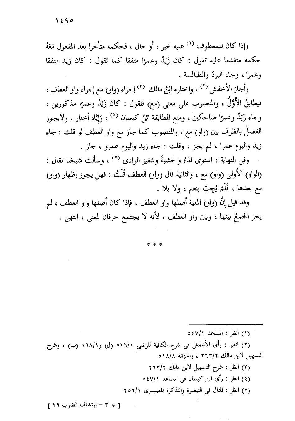 وفي النهاية: استوى الماء والشخبة وشفير الوادي، وسألت شيخنا فقال: (الواو) الأولى (واو) مع، والثانية قال (واو) العطف قلت: فهل يجوز إظهار (واو) مع بعدها، فلم يجب بنعم، ولا بلا.