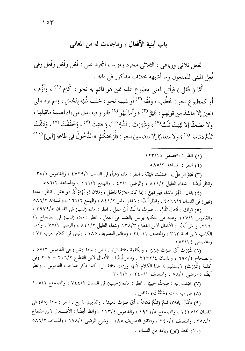 أما (فعل) فيأتي لمعنى مطبوع عليه ممن هو قائم به نحو: كرم، ولؤم، أو كمطبوع نحو: خطب، وفقه أو شبهه نحو: جنب شبه بنجس، ولم يرد يائي العين إلا ما شذ من قولهم: هيؤ؛ وأما نهو فالواو فيه بدل من ياء لضمة ما قبلها، ولا مضعفًا إلا لبيت تلب، وشررت: تشر، وحببت، وخففت، ودممت تدم دمامة؛ ولا متعديًا إلا بتضمين نحو: «أرحبكم» الدخول في طاعة [ابن]