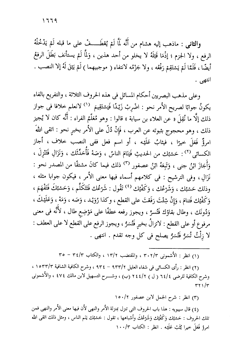 وعلى مذهب البصريين أحكام المسائل في هذه الحروف الثلاثة، والتفريع بالفاء يكون جوابًا لصريح الأمر نحو: اضرب زيدًا فيستقيم لا نعلم خلافًا في جواز ذلك إلا ما نقل «عن العلاء بن سيابة» قالوا: وهو معلم الفراء: أنه كان لا يجيز ذلك، وهو محجوج بثبوته عنا لعرب، فإن دل على الأمر يخبر نحو: اتقي الله امرؤ فعل خيرًا، فيثاب عليه، أو اسم فعل ففي النصب خلاف، أجاز الكسائي: حسبك من الحديث فينام الناس، وصه فأحدثك، ونزال فتنزل، وأجاز ابن جني، وتبعه ابن عصفور ذلك فيما كان مشتقًا من المصدر نحو: نزال، وفي الترشيح: في كلامهم أسماء فيها معنى الأمر، فيكون جوابًا مثله، وذلك حسبك، وشرعك، وكفيك تقول: شرعك فتتكلم، وحسبك فتفهم، وكفيك فتنام، وإن شئت رفعت على القطع، وكذا رويد، وصه، ومه، وعليك، ودونك، وطال بقاؤك فتسر، ويجوز رفعه عطفًا على موضع طال، لأنه في معنى مرفوع أو على القطع: لا تزال بخير فتسر، ويجوز الرفع على القطع لا على العطف: لا زلت تسر فتسر يصلح في كل وجه تقدم. انتهى.