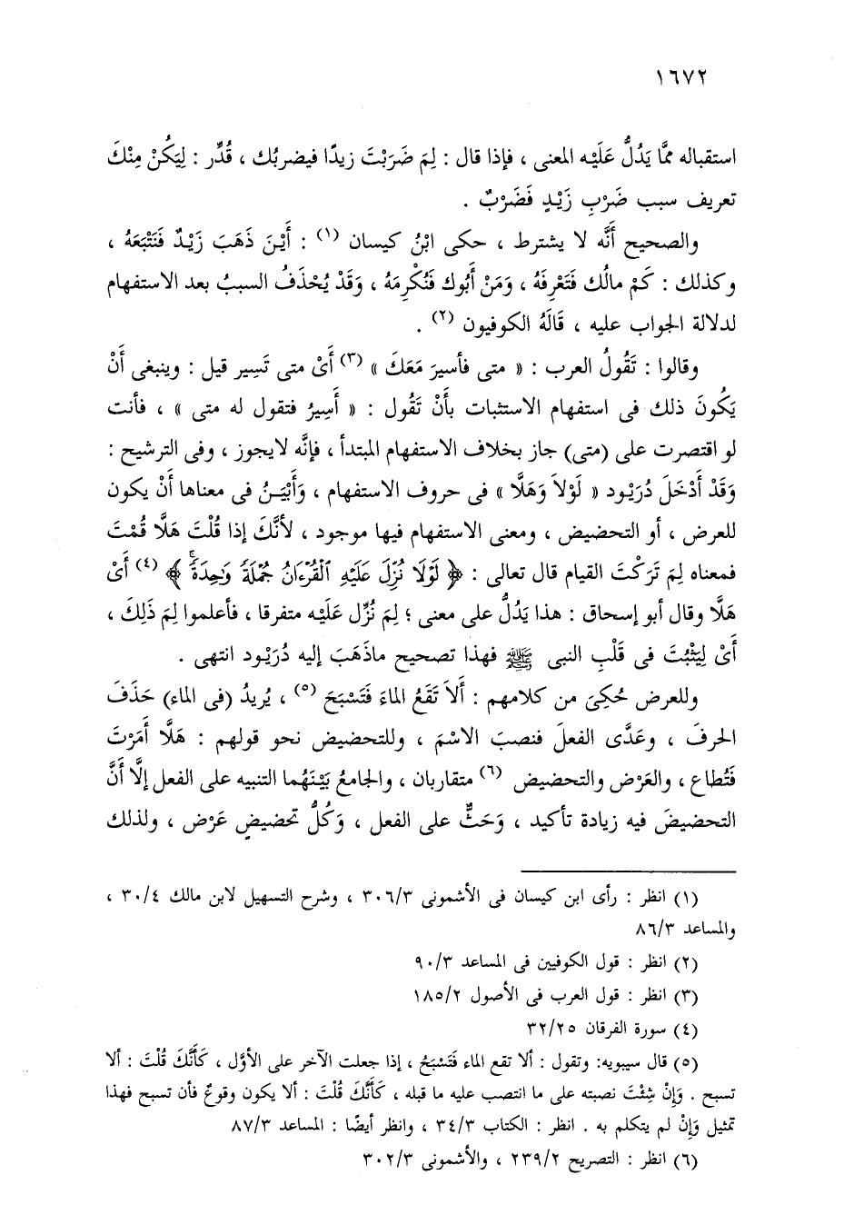 وقالوا: تقول العرب: «متى فأسير معك» أي متى تسير قيل: وينبغي أن يكون ذلك في استفهام الاستثبات بأن تقول: «أسير فتقول له متى»، فأنت لو اقتصرت على (متى) جاز بخلاف الاستفهام المبتدأ، فإنه لا يجوز، وفي الترشيح: وقد أدخل دريود «لولا وهلا» في حروف الاستفهام، وأبين في معناها أن يكون للعرض، أو التحضيض، ومعنى الاستفهام فيها موجود، لأنك إذا قلت هلا قمت فمعناه لم تركت القيام قال تعالى: «لولا نزل عليه القرآن جملة واحدة» أي هلا وقال أبو إسحاق: هذا يدل على معنى؛ لم نزل عليه متفرقًا، فأعلموا لم ذلك، أي ليثبت في قلب النبي × فهذا تصحيح ما ذهب إليه دريود انتهى.