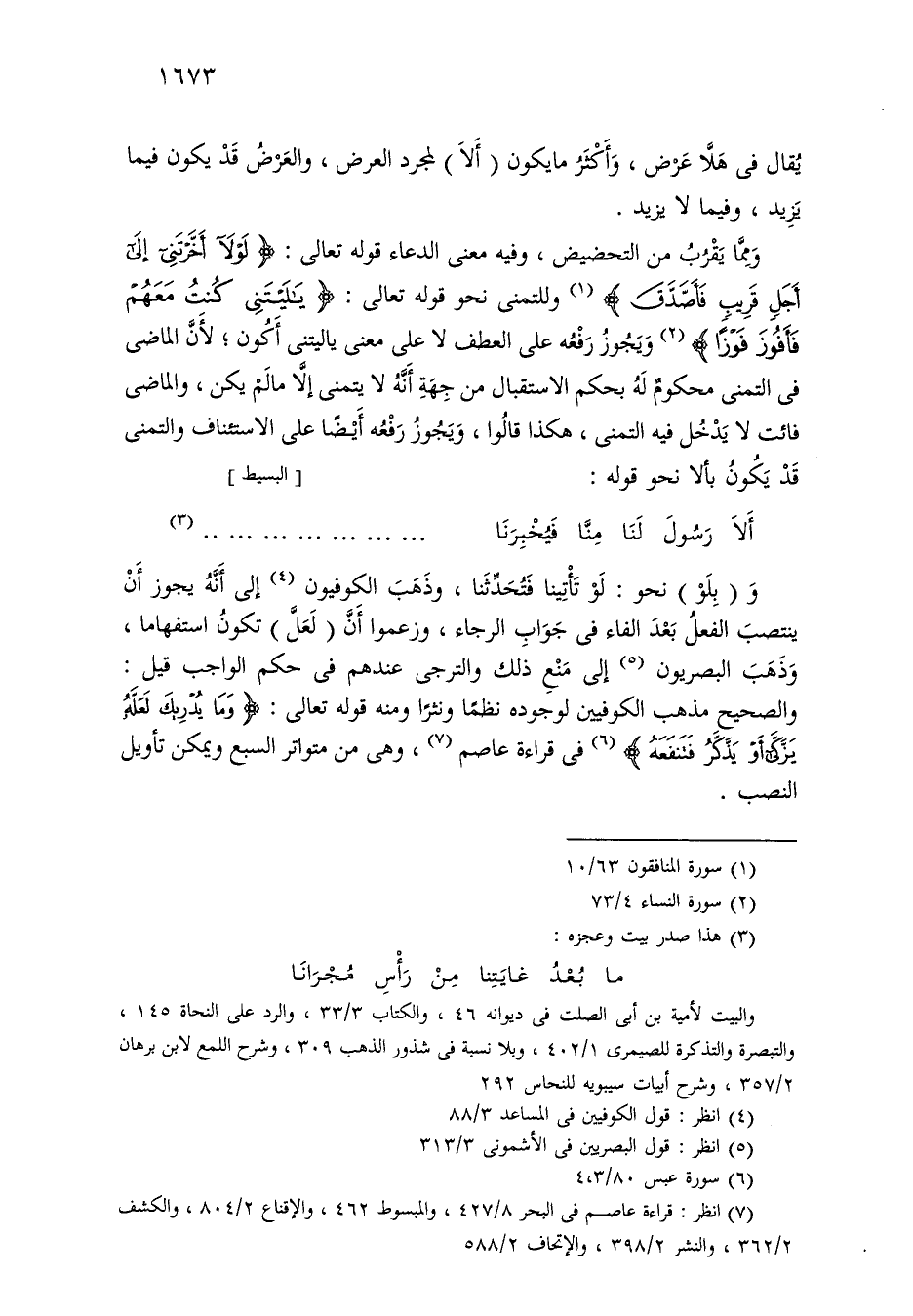 ومما يقرب من التحضيض، وفي معنى الدعاء قوله تعالى: «لولا أخرتني إلى أجل قريب فأصدق» وللتمني نحو قوله تعالى: «يا ليتني كنت معهم فأفوز فوزًا» ويجوز رفعه على العطف لا على معنى يا ليتني أكون؛ لأن الماضي في التمني محكوم له بحكم الاستقبال من جهة أنه لا يتمنى إلا ما لم يكن، والماضي فائت لا يدخل فيه التمني، هكذا قالوا، ويجوز رفعه أيضًا على الاستئناف والتمني قد يكون بألا نحو قوله:
