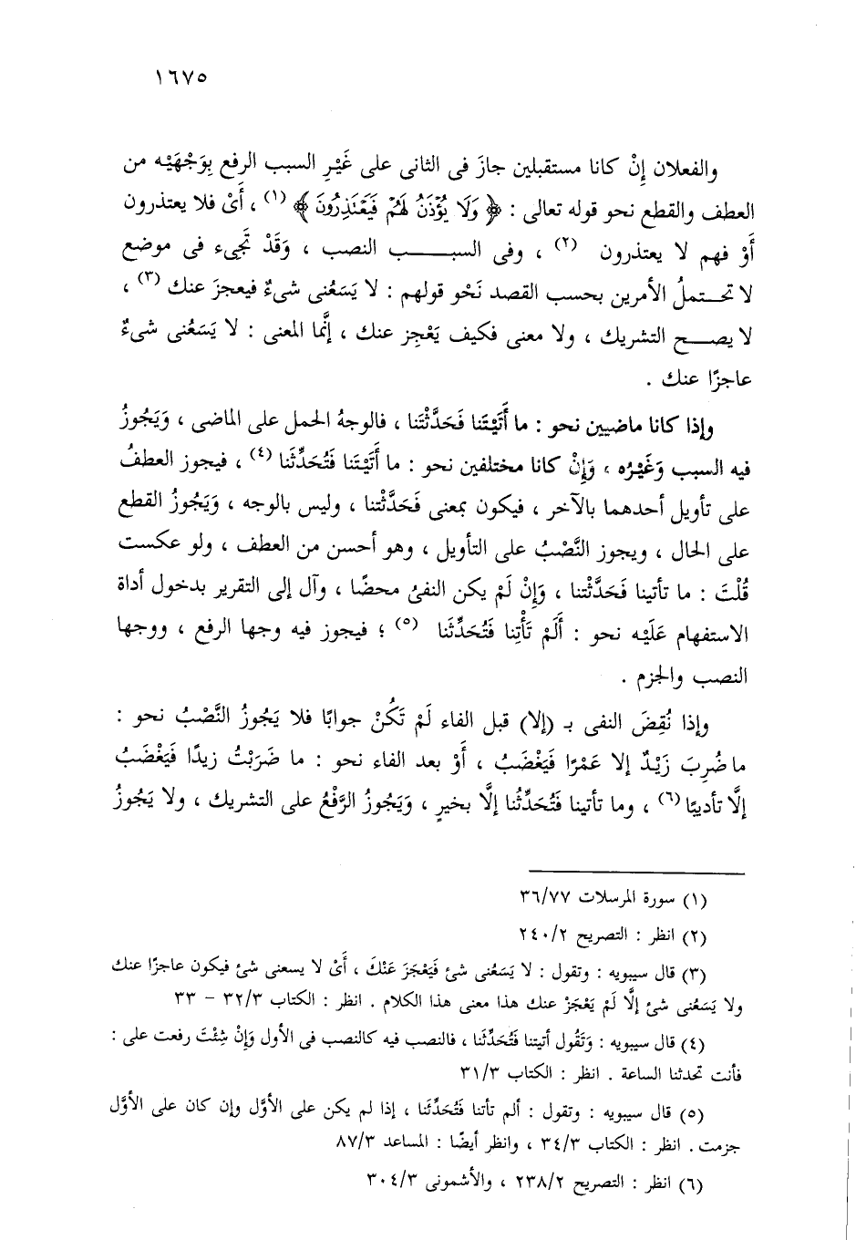والفعلان إن كانا مستقبلين جاز في الثاني على غير السبب الرفع بوجهيه من العطف والقطع نحو قوله تعالى: «ولا يؤذن لهم فيعتذرون»، أي فلا يعتذرون أو فهم لا يعتذرون، وفي السبب النصب، وقد تجيء في موضع لا تحتمل الأمرين بحسب القصد نحو قولهم: لا يسعني شيء فيعجز عنك، لا يصح التشريك، ولا معنى فكيف يعجز عنك، إنما المعنى: لا يسعني شيء عاجزًا عنك.