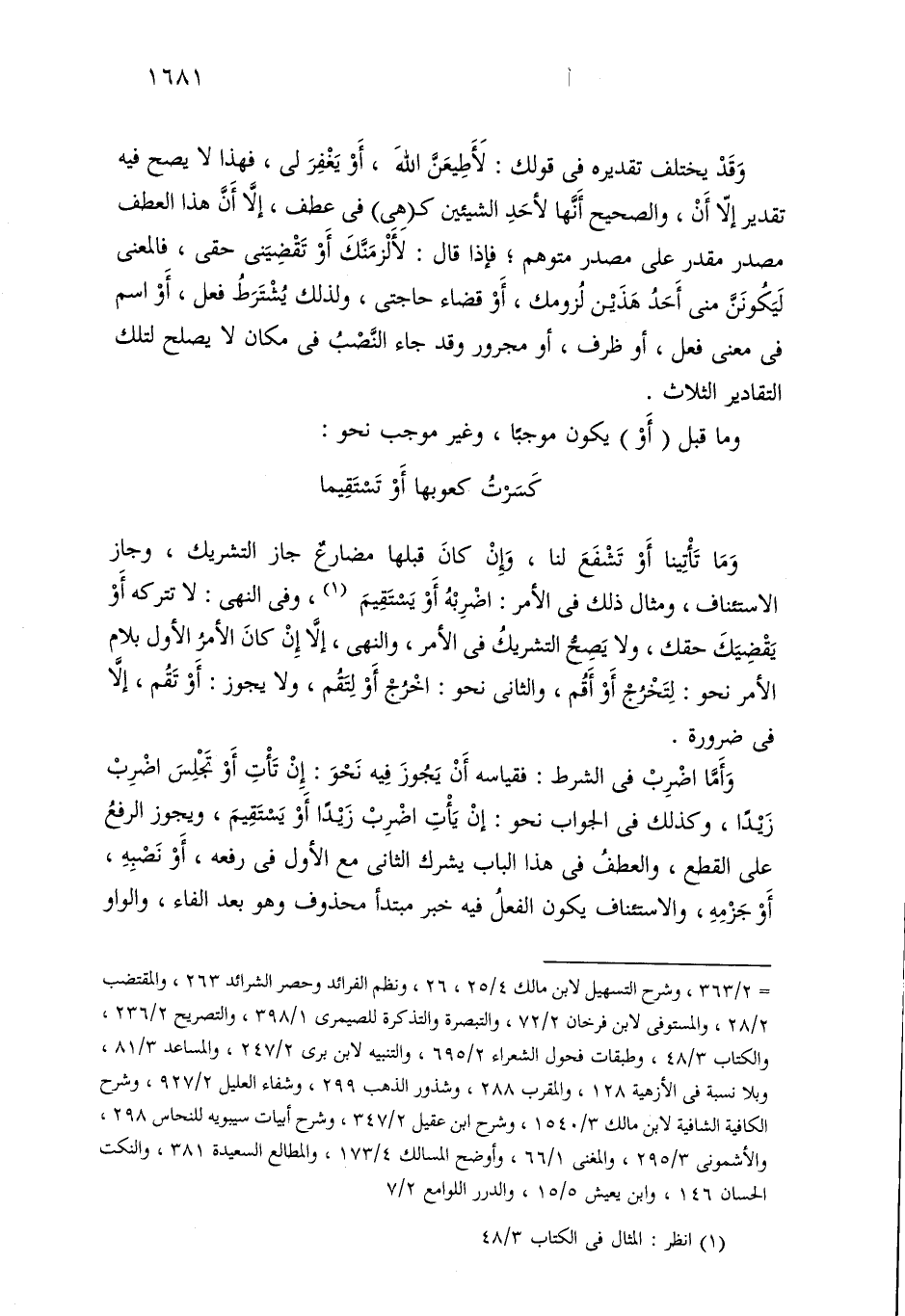 وقد يختلف تقديره في قولك: لأطيعن الله، أو يغفر لي، فهذا لا يصح فيه تقدير إلا أن، والصحيح أنها لأحد الشيئين كـ (هي) في عطف، إلا أن هذا العطف مصدر مقدر على مصدر متوهم؛ فإذا قال: لألزمنك أو تقضني حقي، فالمعنى ليكونن مني أحد هذين لزومك، أو قضاء حاجتي، ولذلك يشترط فعل، أو اسم في معنى فعل، أو ظرف، أو مجرور وقد جاء النصب في مكان لا يصلح لتلك التقادير الثلاث.