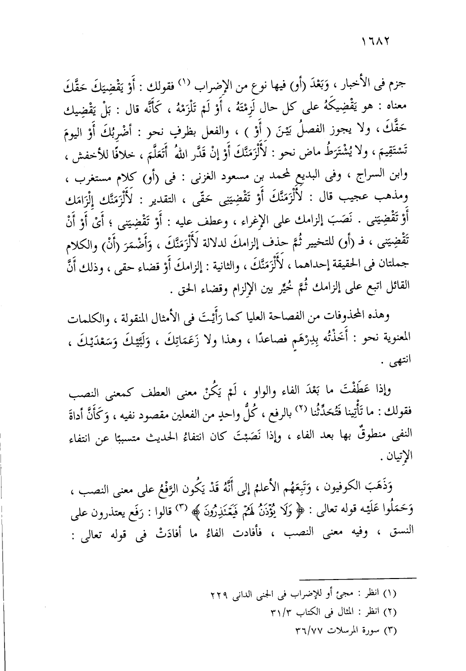 جزم في الأخبار، وبعد (أو) فيها نوع من الإضراب فقولك: أو يقضيك حقك معناه: هو يقضيكه على كل حال لزمته، أو لم تلزمه، كأنه قال: بل يقضيك حقك، ولا يجوز الفصل بين (أو)، والفعل بظرف نحو: أضربك أو اليوم تستقيم، ولا يشترط ماض نحو: لألزمنك أو إن قدر الله أتعلم، خلافًا للأخفش، وابن السراج، وفي البديع لمحمد بن مسعود الغزني: في (أو) كلام مستغرب، ومذهب عجيب قال: لألزمنك أو تقضيني حقي، التقدير: لألزمنك إلزامك أو تقضيني. نصب إلزامك على الإغراء، وعطف عليه: أو تقضيني؛ أي أو أن تقضيني، فـ (أو) للتخيير ثم حذف إلزامك لدلالة لألزمنك، وأضمر (أن) والكلام جملتان في الحقيقة إحداهما، لألزمنك، والثانية: إلزامك أو قضاء حقي، وذلك أن القائل اتبع علي إلزامك ثم خير بين الإلزام وقضاء الحق.