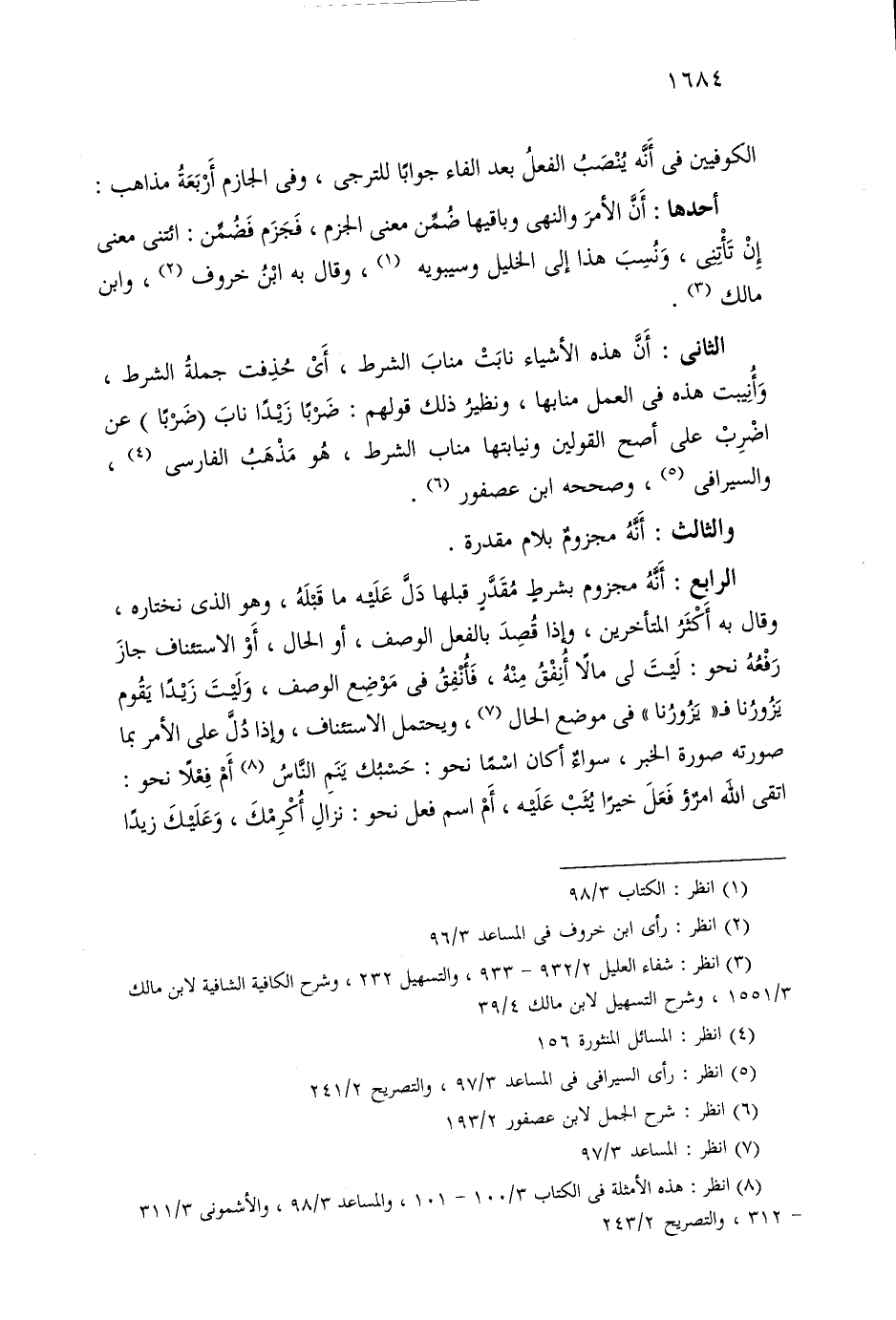 الكوفيين في أنه ينصب الفعل بعد الفاء جوابًا للترجي، وفي الجازم أربعة مذاهب:
