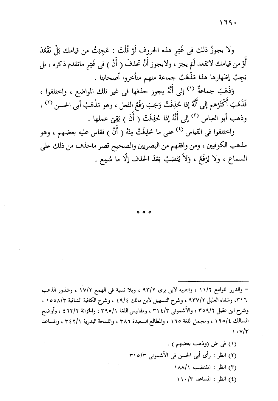 ولا يجوز ذلك في غير هذه الحروف لو قلت: عجبت من قيامك بل تقعد أو من قيامك لا تقعد لم يجز، ولا يجوز أن تحذف (أن) في غير ما تقدم ذكره، بل يجب إظهارها هذا مذهب جماعة منهم متأخرو أصحابنا.