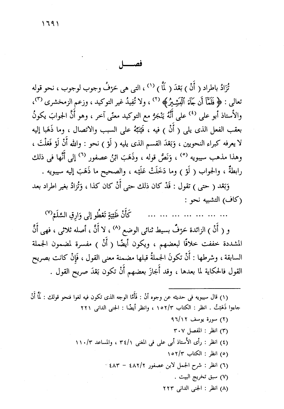 تزاد باطراد (أن) بعد (لما)، التي هي حرف وجوب لوجوب، نحو قوله تعالى: «فلما أن جاء البشير»، ولا تفيد غير التوكيد، وزعم الزمخشري، والأستاذ أبو علي على أنه ينجر مع التوكيد معنى آخر، وهو أن الجواب يكون بعقب الفعل الذي يلي (أن) فيه، فينبه على السبب والاتصال، وما ذهبا إليه لا يعرفه كبراء النحويين، وبعد القسم الذي يليه (لو) نحو: والله أن لو فعلت، وهذا مذهب سيبويه، ونص قوله، وذهب ابن عصفور إلى أنها في ذلك رابطة، والجواب (لو) وما دخلت عليه، والصحيح ما ذهب إليه سيبويه.