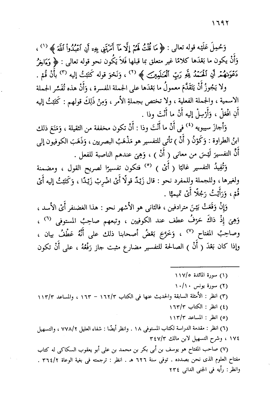 وحمل عليه قوله تعالى: «ما قلت لهم إلا ما أمرتني به أن أعبدوا الله»، وأن يكون ما بعدها كلامًا غير متعلق بما قبلها فلا يكون نحو قوله تعالى: «وآخر دعواهم أن الحمد لله رب العالمين»، ونحو قوله كتبت إليه بأن قم.