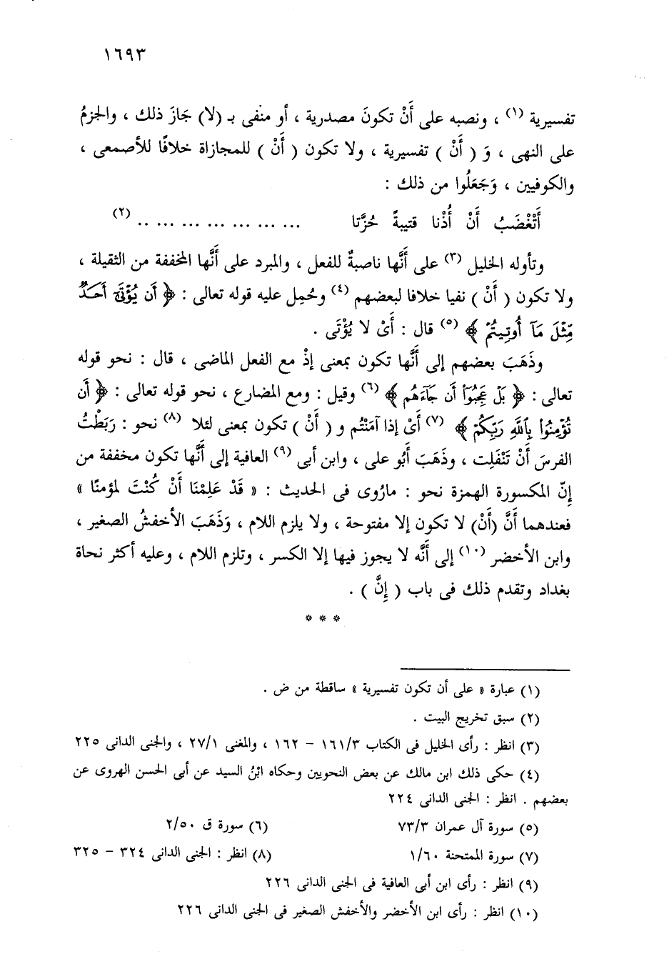 وتأوله الخليل على أنها ناصبة للفعل، والمبرد على أنها المخففة من الثقيلة، ولا تكون (أن) نفيًا خلافًا لبعضهم وحمل عليه قوله تعالى: «أن يؤتى أحد مثل ما أوتيتم» قال: أي لا يؤتى.