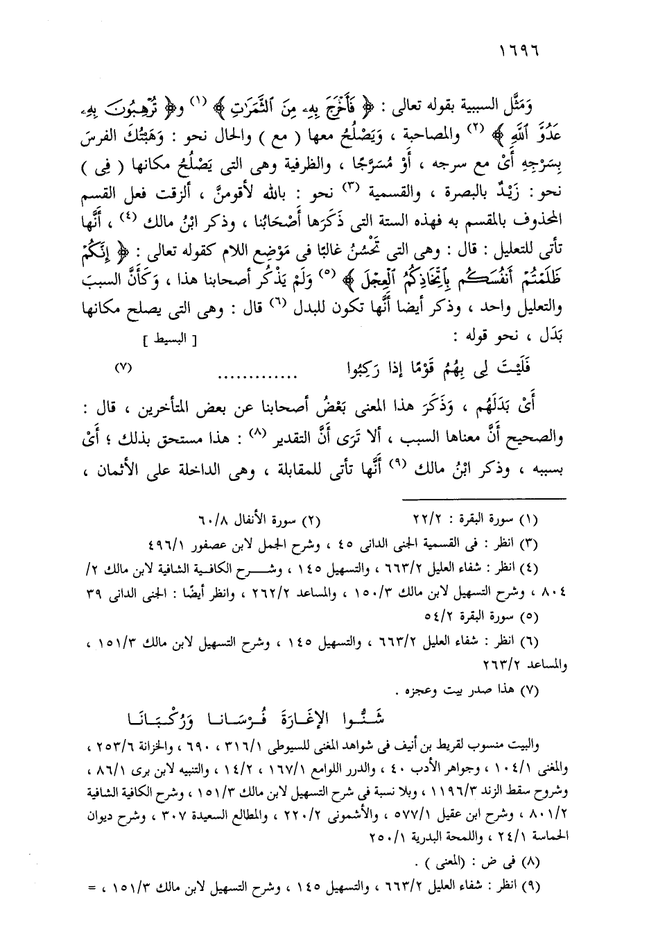 ومثل السببية بقوله تعالى: «فأخرج به من الثمرات» و «ترهبون به عدو الله» والمصاحبة، ويصلح معها (مع) والحال نحو: وهبتك الفرس بسرجه أي مع سرجه، أو مسرجًا، والظرفية وهي التي يصلح مكانها (في) نحو: زيد بالبصرة، والقسمية نحو: بالله لأقومن، ألزقت فعل القسم المحذوف بالمقسم به فهذه الستة التي ذكرها أصحابنا، وذكر ابن مالك، أنها تأتي للتعليل: قال: وهي التي تحسن غالبًا في موضع اللام كقوله تعالى: «إنكم ظلمتم أنفسكم باتخاذكم العجل» ولم يذكر أصحابنا هذا، وكأن السبب والتعليل واحد، وذكر أيضًا أنها تكون للبدل قال: وهي التي يصلح مكانها بدل، نحو قوله:
