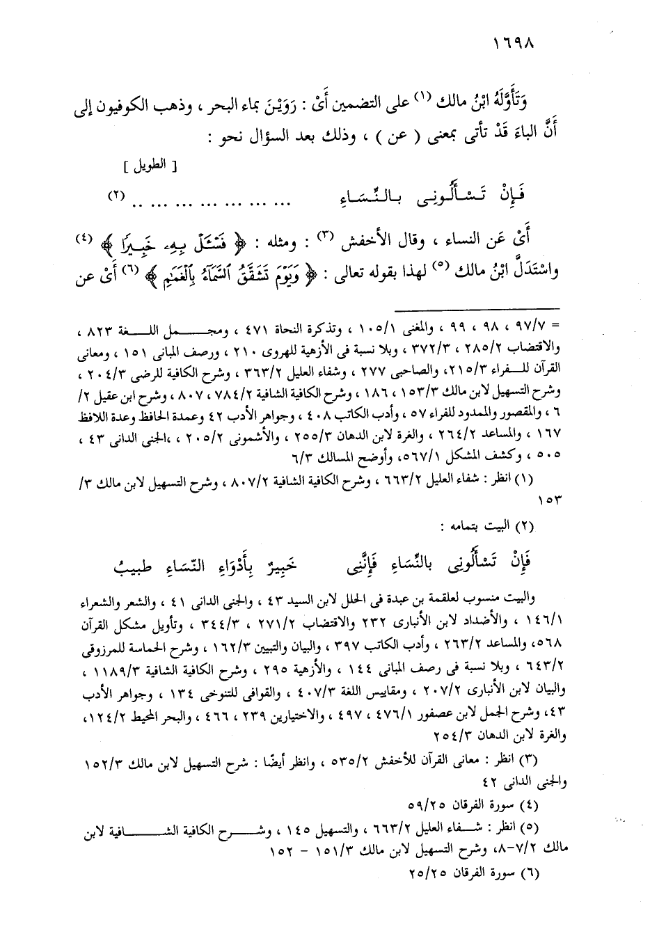 أي عن النساء، وقال الأخفش: ومثله: «فسئل به خبيرا» واستدل ابن مالك لهذا بقوله تعالى: «ويوم تشقق السماء بالغمام» أي عن