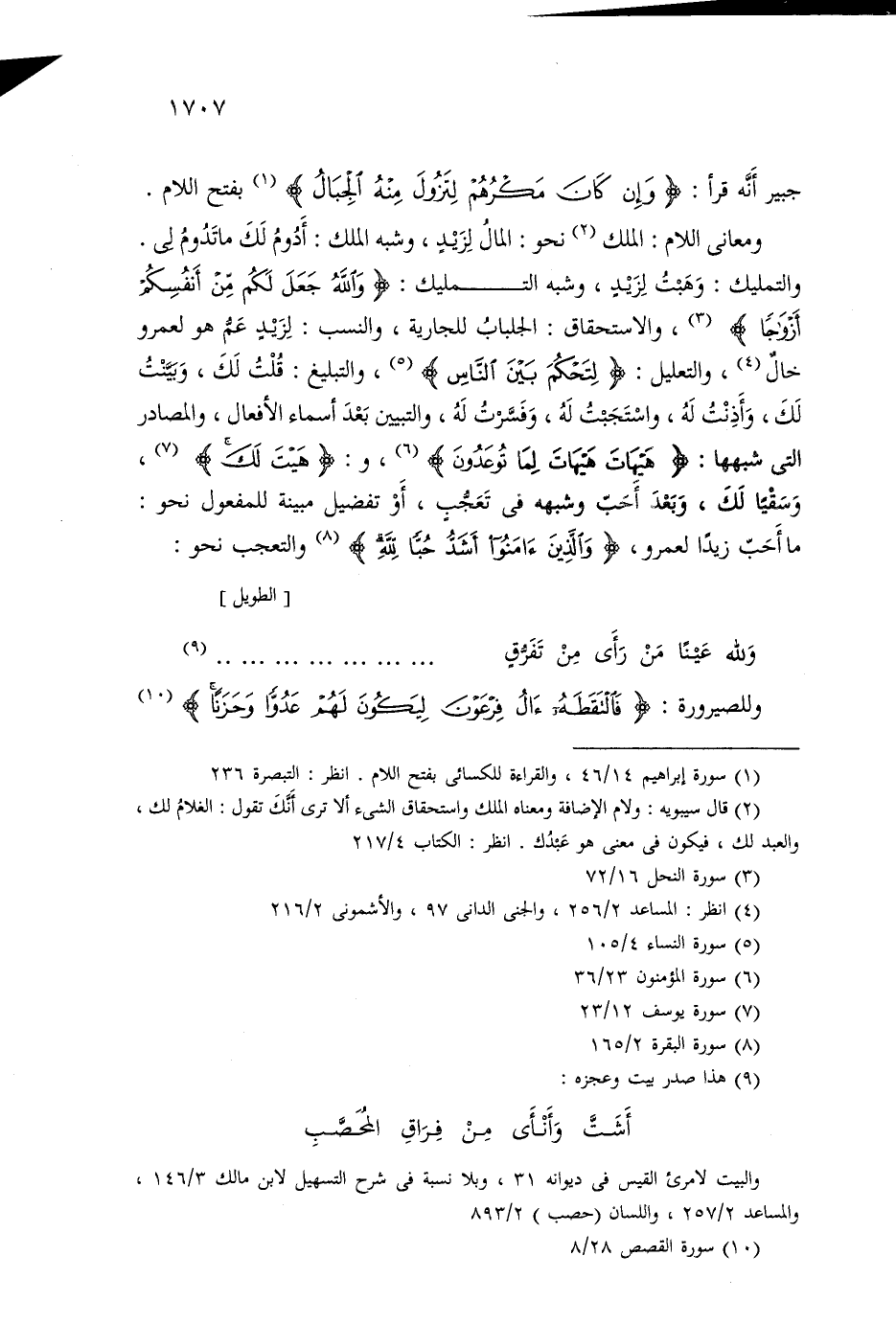والتمليك: وهبت لزيد، وشبه التمليك: «والله جعل لكم من أنفسكم أزواجا»، والاستحقاق: الجلباب للجارية، والنسب: لزيد عم هو لعمرو خال، والتعليل: «لتحكم بين الناس»، والتبليغ: قلت لك، وبينت لك، وأذنت له، واستجبت له، وفسرت له، والتبيين بعد أسماء الأفعال، والمصادر التي شبهها: «هيهات هيهات لما توعدون»، و: «هيت لك»، وسقيا لك، وبعد أحب وشبهه في تعجب، أو تفضيل مبينة للمفعول نحو: ما أحب زيدًا لعمرو، «والذين آمنوا أشد حبا لله» والتعجب نحو: