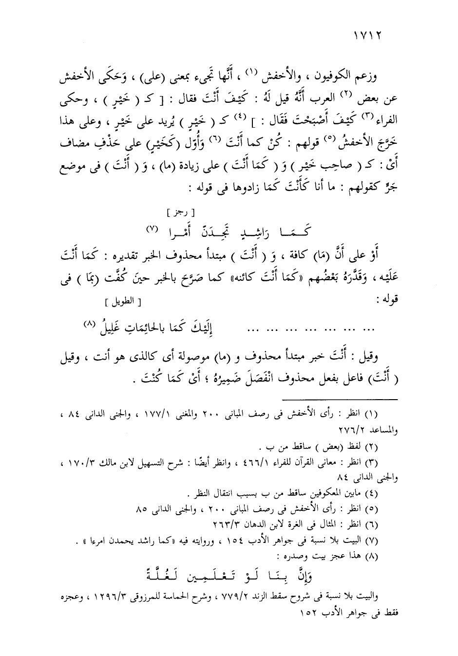 وزعم الكوفيون، والأخفش، أنها تجيء بمعنى (على)، وحكى الأخفش عن بعض العرب أنه قيل له: كيف أنت فقال: [كـ (خير)، وحكى الفراء كيف أصبحت فقال:] كـ (خير) يريد على خير، وعلى هذا خرج الأخفش قولهم: كن كما أنت وأول (كخير) على حذف مضاف أي: كـ (صاحب خير) و (كما أنت) على زيادة (ما)، و (أنت) في موضع جر كقولهم: ما أنا كأنت كما زادوها في قوله: