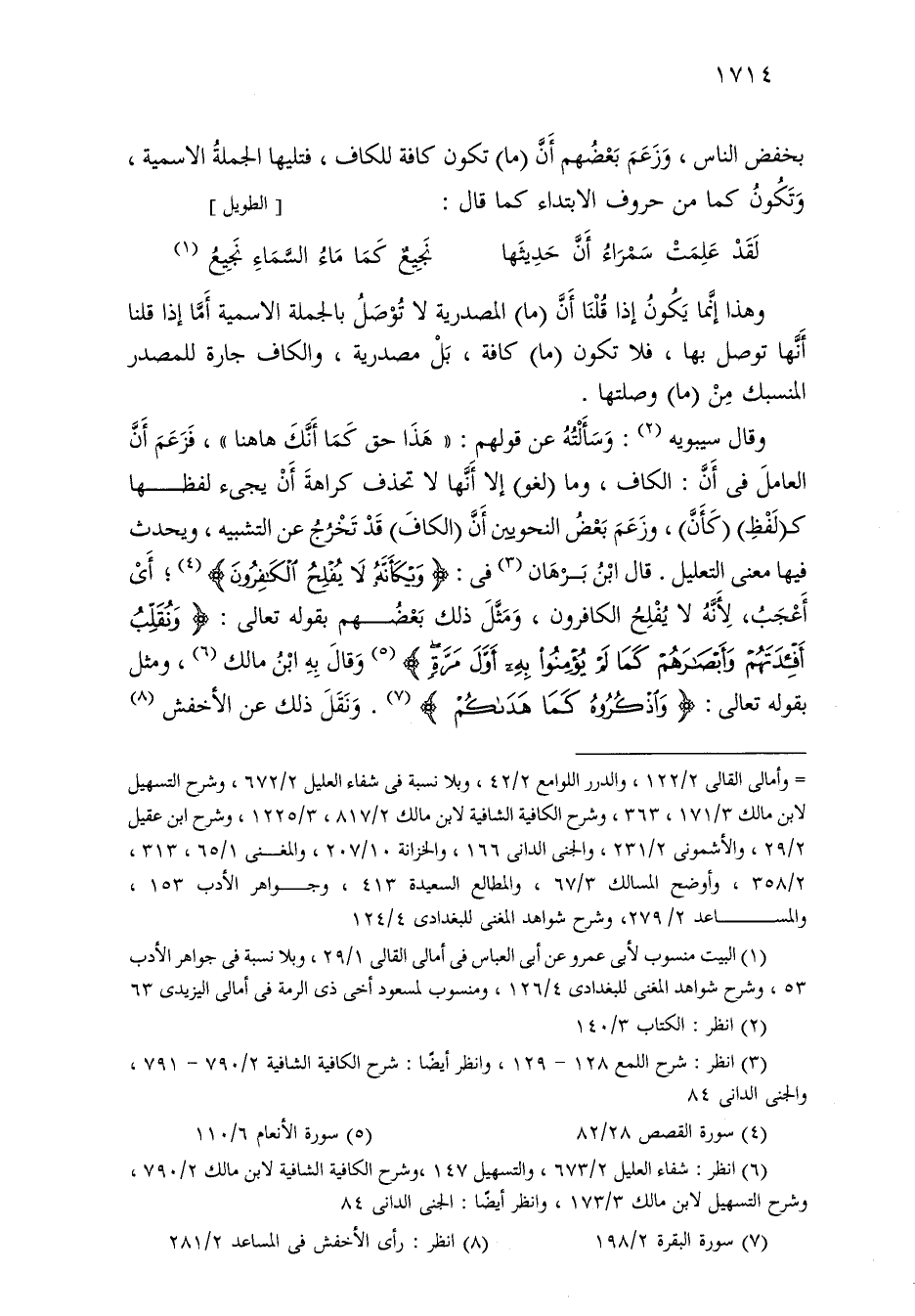 بخفض الناس، وزعم بعضهم أن (ما) تكون كافة للكاف، فتليها الجملة الاسمية، وتكون كما من حروف الابتداء كما قال: