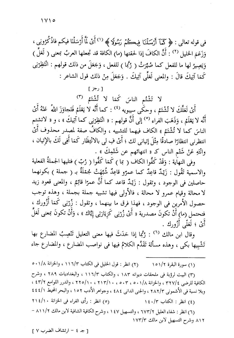 في قوله تعالى: «كما أرسلنا فيكم رسولا» أي لما أرسلنا فيكم فاذكروني، وزعم الخليل: أن الكاف إذا لحقتها (ما) الكافة قد تجعلها العرب بمعنى (لعل) ويصير لها ما للفعل كما صيرت (ربما) للفعل، وجعل من ذلك قولهم: انتظرني كما آتيك قال: والمعنى لعلي آتيك. وجعل من ذلك قول الشاعر: