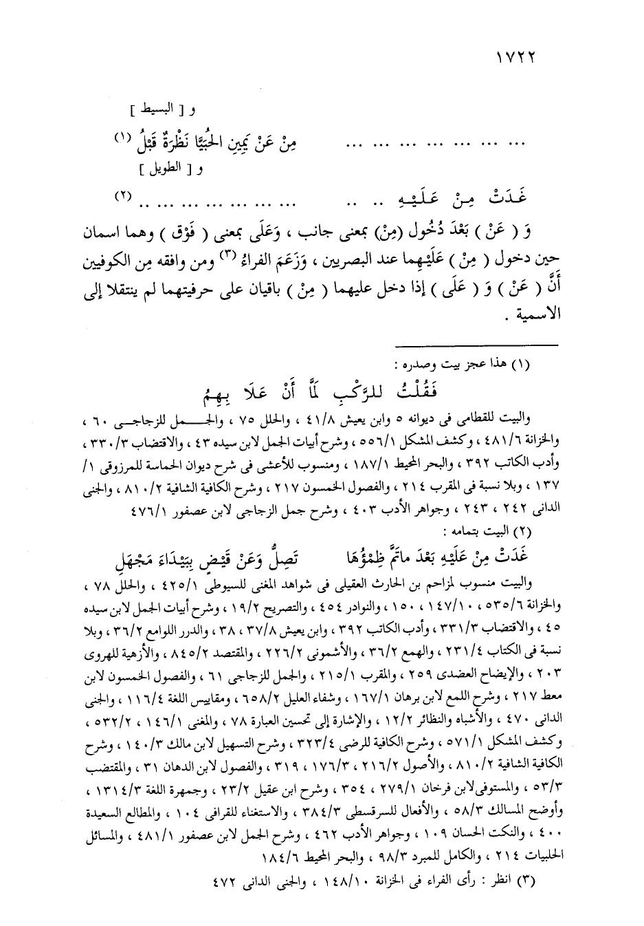 و (عن) بعد دخول (من) بمعنى جانب، وعلى بمعنى (فوق) وهما اسمان حين دخول (من) عليهما عند البصريين، وزعم الفراء ومن وافقه من الكوفيين أن (عن) و (على) إذا دخل عليهما (من) باقيان على حرفيتهما لم ينتقلا إلى الاسمية.