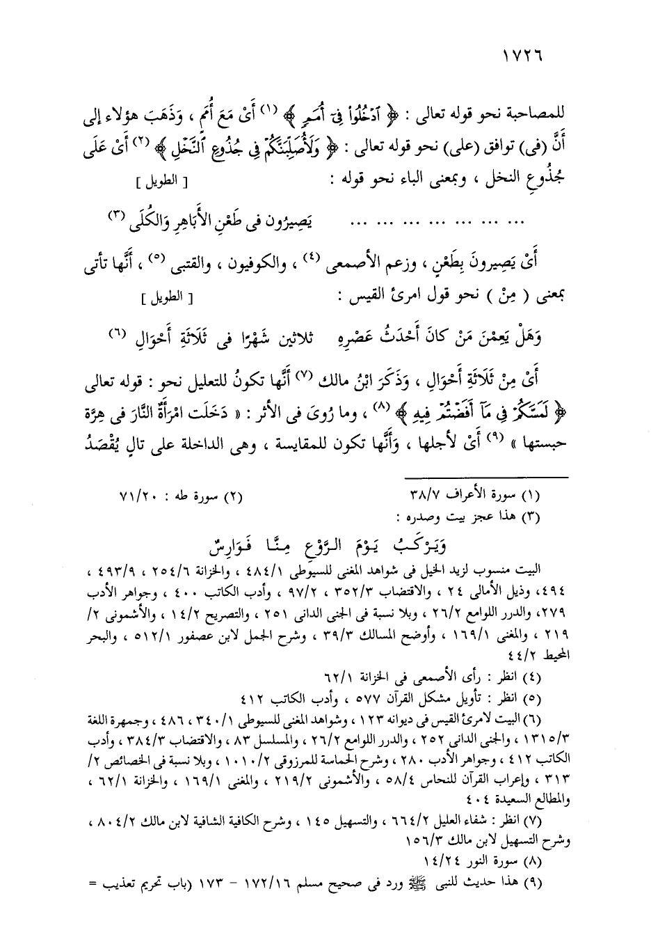 أي من ثلاثة أحوال، وذكر ابن مالك أنها تكون للتعليل نحو: قوله تعالى: «لمسكم في ما أفضتم فيه»، وما روى في الأثر: «دخلت امرأة النار في هرة حبستها» أي لأجلها، وأنها تكون للمقايسة، وهي الداخلة على تالٍ يقصد