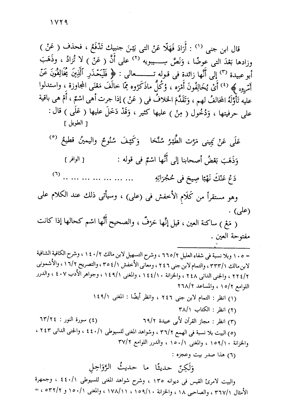 قال ابن جني: أراد فهلا عن التي بين جنبيك تدفع، فحذف (عن) وزادها بعد التي عوضًا، ونص سيبويه على أن (عن) لا تزاد، وذهب أبو عبيدة إلى أنها زائدة في قوله تعالى: «فليحذر الذين يخالفون عن أمره» أي يخالفون أمره، وكل ما ذكروه مما خالف معنى المجاوزة، واستدلوا عليه تأوله المخالف لهم، وتقدم الخلاف في (عن) إذا جرت أهي اسم، أم هي باقية على حرفيتها، ودخول (من) عليها كثير، وقد دخل عليها (على) قال: