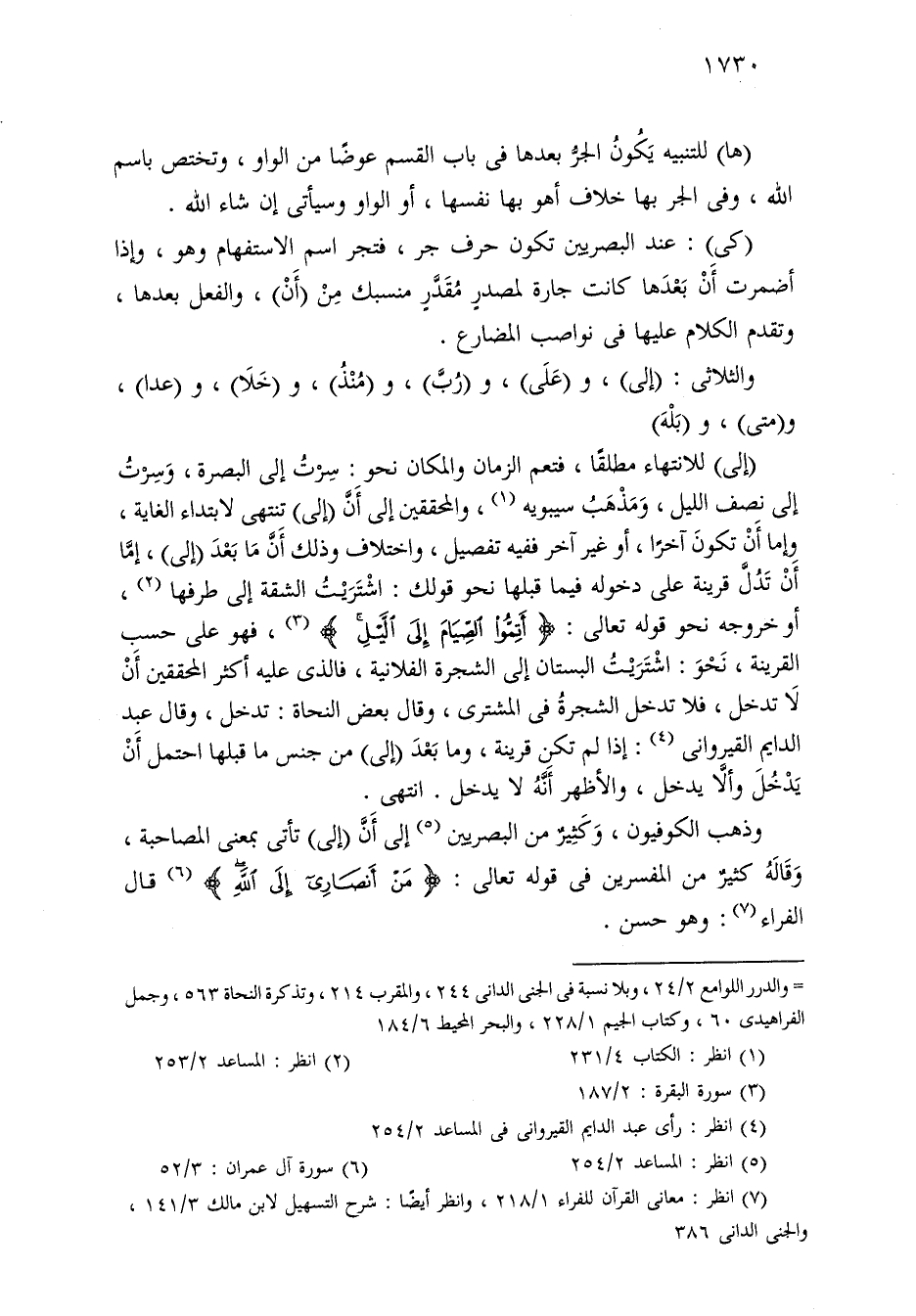 (إلى) للانتهاء مطلقًا، فتعم الزمان والمكان نحو: سرت إلى البصرة، وسرت إلى نصف الليل، ومذهب سيبويه، والمحققين إلى أن (إلى) تنتهي لابتداء الغاية، وإما أن تكون آخرًا، أو غير آخر ففيه تفصيل، واختلاف وذلك أن ما بعد (إلى)، إما أن تدل قرينة على دخوله فيما قبلها نحو قولك: اشتريت الشقة إلى طرفها، أو خروجه نحو قوله تعالى: «أتموا الصيام إلى الليل»، فهو على حسب القرينة، نحو: اشتريت البستان إلى الشجرة الفلانية، فالذي عليه أكثر المحققين أن لا تدخل، فلا تدخل الشجرة في المشتري، وقال بعض النحاة: تدخل، وقال عبد الدايم القيرواني: إذا لم تكن قرينة، وما بعد (إلى) من جنس ما قبلها احتمل أن يدخل وألا يدخل، والأظهر أنه لا يدخل. انتهى.