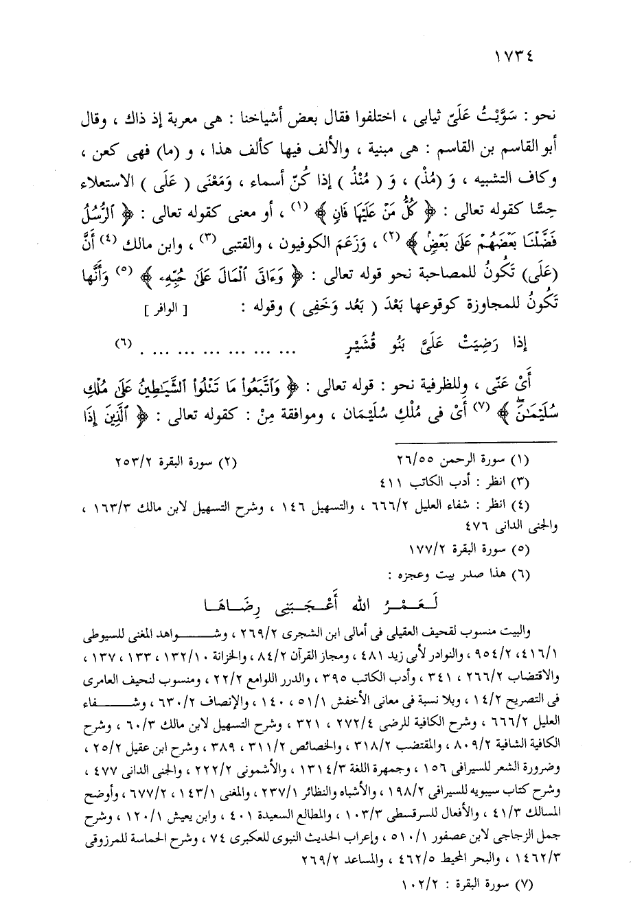 نحو: سويت على ثيابي، اختلفوا فقال بعض أشياخنا: هي معربة إذ ذاك، وقال أبو القاسم بن القاسم: هي مبنية، والألف فيها كألف هذا، و (ما) فهي كعن، وكاف التشبيه، و (مذ)، و (منذ) إذا كن أسماء، ومعنى (على) الاستعلاء حسا كقوله تعالى: «كل من عليها فان»، أو معنى كقوله تعالى: «الرسل فضلنا بعضهم على بعض»، وزعم الكوفيون، والقتبي، وابن مالك أن (على) تكون للمصاحبة نحو قوله تعالى: «وآتى المال على حبه» وأنها تكون للمجاوزة كوقوعها بعد (بعد وخفى) وقوله: