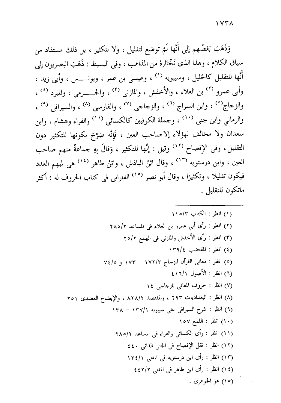وذهب بعضهم إلى أنها لم توضع لتقليل، ولا لتكثير، بل ذلك مستفاد من سياق الكلام، وهذا الذي نختاره من المذاهب، وفي البسيط: ذهب البصريون إلى أنها للتقليل كالخليل، وسيبويه، وعيسى بن عمر، ويونس، وأبي زيد، وأبي عمرو بن العلاء، والأخفش، والمازني، والجرمي، والمبرد، والزجاج، وابن السراج، والزجاجي، والفارسي، والسيرافي، والرماني وابن جني، وجملة الكوفيين كالكسائي والفراء وهشام، وابن سعدان ولا مخالف لهؤلاء إلا صاحب العين، فإنه صرح بكونها للتكثير دون التقليل، وفي الإفصاح وقيل: إنها للتكثير، وقال به جماعة منهم صاحب العين، وابن درستويه، وقال ابن الباذش، وابن طاهر هي لمبهم العدد فيكون تقليلاً، وتكثيرًا، وقال أبو نصر الفارابي في كتاب الحروف له: أكثر ما تكون للتقليل.
