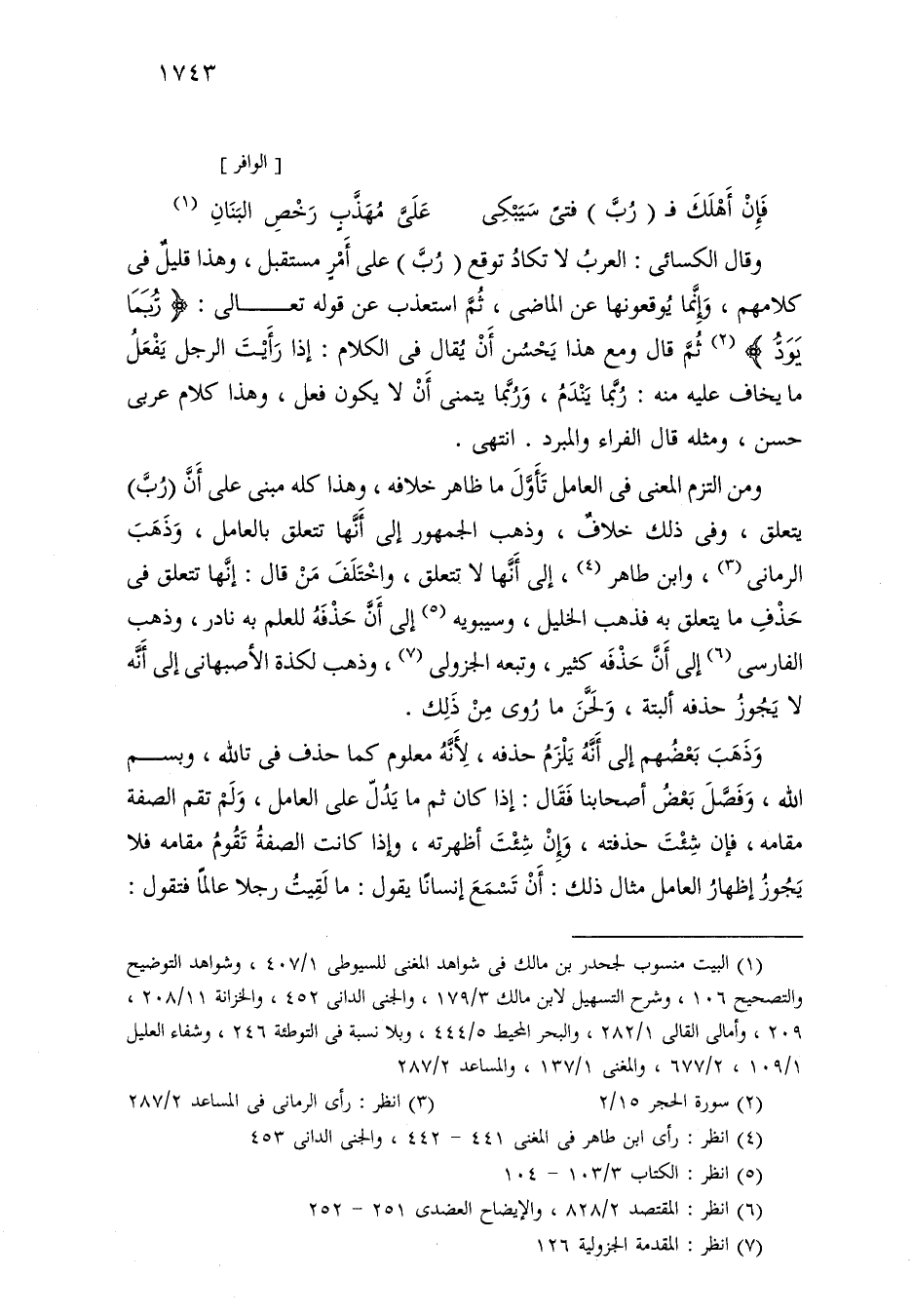 ومن التزم المعنى في العامل تأول ما ظاهر خلافه، وهذا كله مبني على أن (رب) يتعلق، وفي ذلك خلاف، وذهب الجمهور إلى أنها تتعلق بالعامل، وذهب الرماني، وابن طاهر، إلى أنها لا تتعلق، واختلف من قال: إنها تتعلق في حذف ما يتعلق به فذهب الخليل، وسيبويه إلى أن حذفه للعلم به نادر، وذهب الفارسي إلى أن حذفه كثير، وتبعه الجزولي، وذهب لكذة الأصبهاني إلى أنه لا يجوز حذفه ألبتة، ولحن ما روى من ذلك.