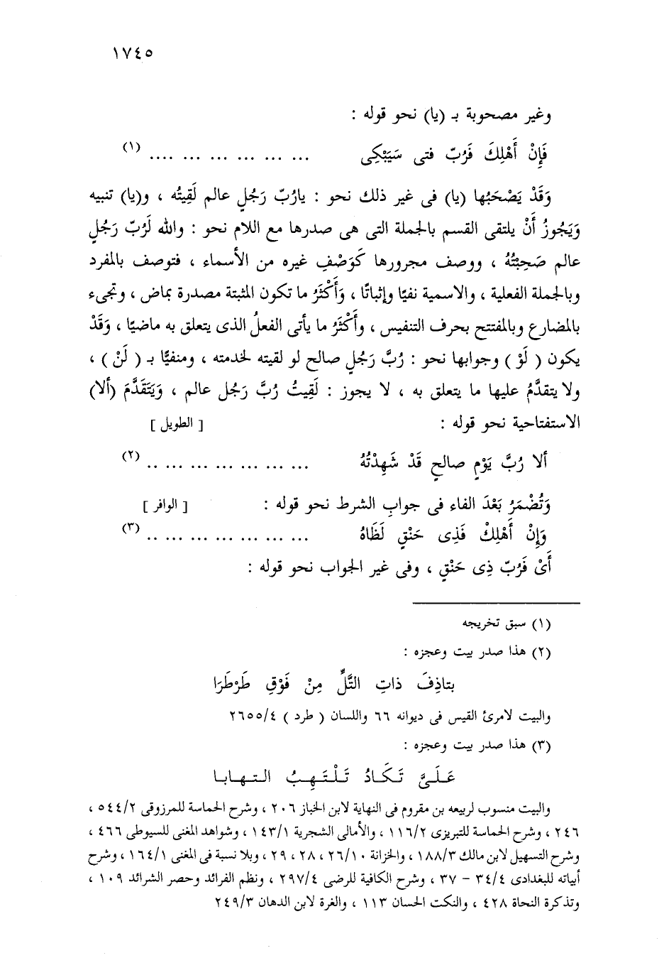 وقد يصحبها (يا) في غير ذلك نحو: يا رب رجل عالم لقيته، و (يا) تنبيه ويجوز أن يلتقي القسم بالجملة التي هي صدرها مع اللام نحو: والله لرب رجل عالم صحبته، ووصف مجرورها كوصف غيره من الأسماء، فتوصف بالمفرد وبالجملة الفعلية، والاسمية نفيًا وإثباتًا، وأكثر ما تكون المثبتة مصدرة بماض، وتجيء بالمضارع وبالمفتتح بحرف التنفيس، وأكثر ما يأتي الفعل الذي يتعلق به ماضيًا، وقد يكون (لو) وجوابها نحو: رب رجل صالح لو لقيته لخدمته، ومنفيًا بـ (لن)، ولا يتقدم عليها ما يتعلق به، لا يجوز: لقيت رب رجل عالم، ويتقدم (ألا) الاستفتاحية نحو قوله: