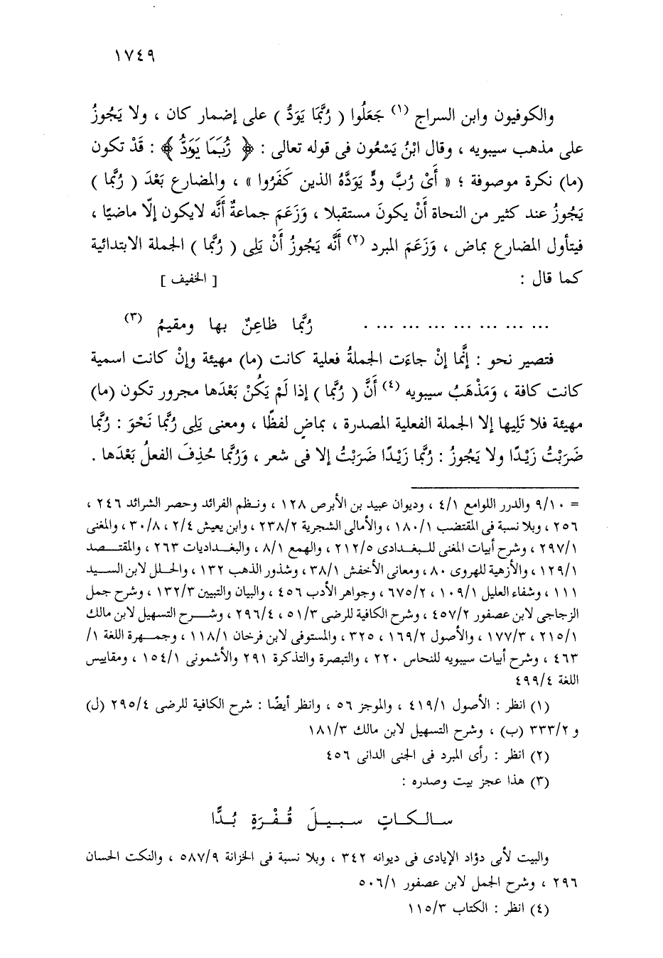 والكوفيون وابن السراج جعلوا (ربما يود) على إضمار كان، ولا يجوز على مذهب سيبويه، وقال ابن يسعون في قوله تعالى: «ربما يود»: قد تكون (ما) نكرة موصوفة؛ «أي رب ود يوده الذين كفروا»، والمضارع بعد (ربما) يجوز عند كثير من النحاة أن يكون مستقبلاً، وزعم جماعة أنه لا يكون إلا ماضيًا، فيتأول المضارع بماض، وزعم المبرد أنه يجوز أن يلي (ربما) الجملة الابتدائية كما قال: