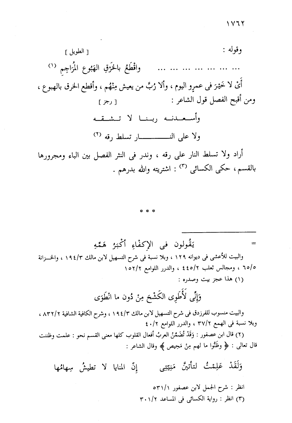 أراد ولا تسلط النار على رقه، وندر في النثر الفصل بين الباء ومجرورها بالقسم، حكى الكسائي: اشتريته والله بدرهم.