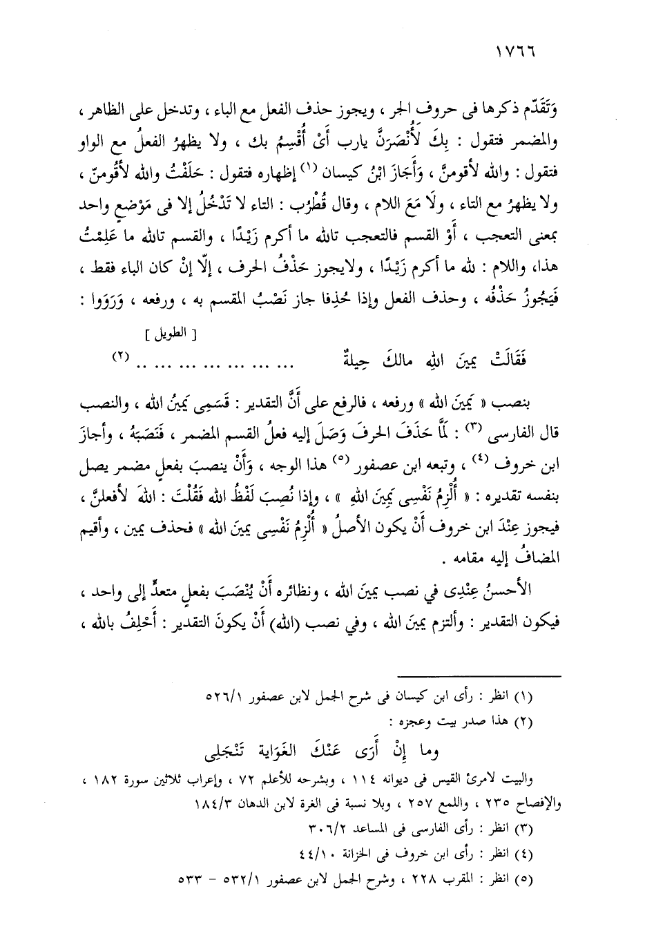 بنصب «يمين الله» ورفعه، فالرفع على أن التقدير: قسمي يمين الله، والنصب قال الفارسي: لما حذف الحرف وصل إليه فعل القسم المضمر، فنصبه، وأجاز ابن خروف، وتبعه ابن عصفور هذا الوجه، وأن ينصب بفعل مضمر يصل بنفسه تقديره: «ألزم نفسي يمين الله»، وإذا نصب لفظ الله فقلت: الله لأفعلن، فيجوز عند ابن خروف أن يكون الأصل «ألزم نفسي يمين الله» فحذف يمين، وأقيم المضاف إليه مقامه.