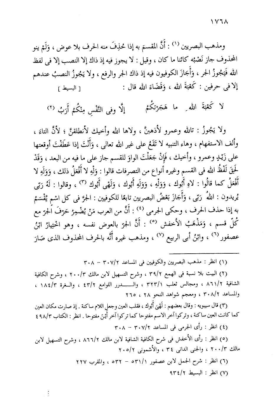 ومذهب البصريين: أن المقسم به إذا حذف منه الحرف بلا عوض، ولم ينو المحذوف جاز نصبه كائنا ما كان، وقيل: لا يجوز فيه إذ ذاك إلا النصب إلا في لفظ الله فيجوز الجر، وأجاز الكوفيون فيه إذ ذاك الجر والرفع، ولا يجوز النصب عندهم إلا في حرفين: كعبة الله، وقضاء الله قال: