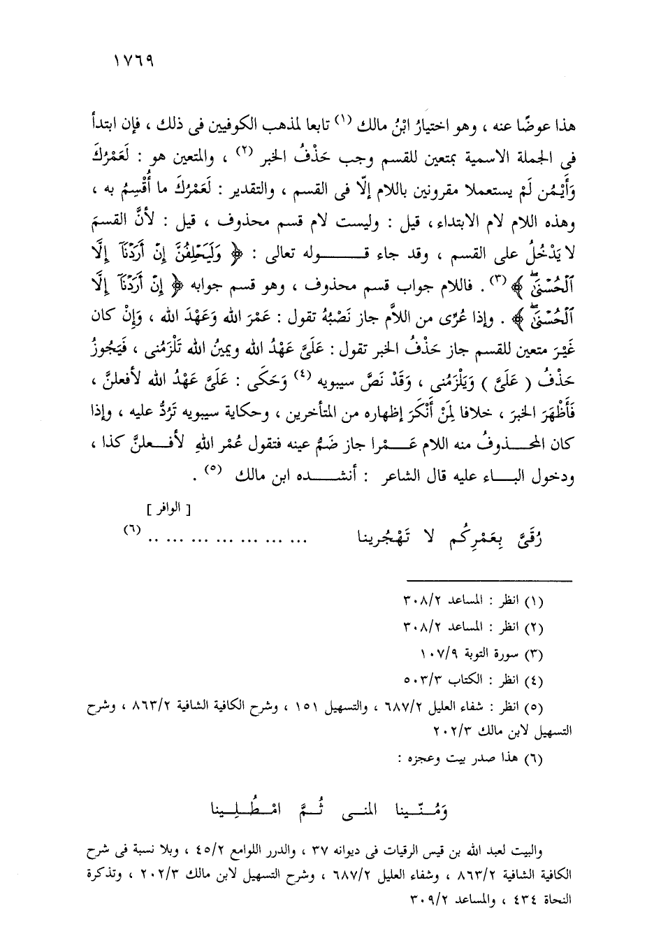هذا عوضًا عنه، وهو اختيار ابن مالك تابعًا لمذهب الكوفيين في ذلك، فإن ابتدأ في الجملة الاسمية بمتعين للقسم وجب حذف البخر، والمتعين هو: لعمرك وأيمن لم يستعملا مقرونين باللام إلا في القسم، والتقدير: لعمرك ما أقسم به، وهذه اللام لام الابتداء، قيل: وليست لام قسم محذوف، قيل: لأن القسم لا يدخل على القسم، وقد جاء قوله تعالى: «وليحلفن إن أردنا إلا الحسنى». فاللام جواب قسم محذوف، وهو قسم جوابه «إن أردنا إلا الحسنى». وإذا عرى من اللام جاز نصبه تقول: عمر الله وعهد الله، وإن كان غير متعين للقسم جاز حذف الخبر تقول: على عهد الله ويمين الله تلزمني، فيجوز حذف (على) ويلزمني، وقد نص سيبويه وحكى: على عهد الله لأفعلن، فأظهر الخبر، خلافًا لمن أنكر إظهاره من المتأخرين، وحكاية سيبويه ترد عليه، وإذا كان المحذوف منه اللام عمرًا جاز ضم عينه فتقول عمر الله لأفعلن كذا، ودخول الباء عليه قال الشاعر: أنشده ابن مالك.