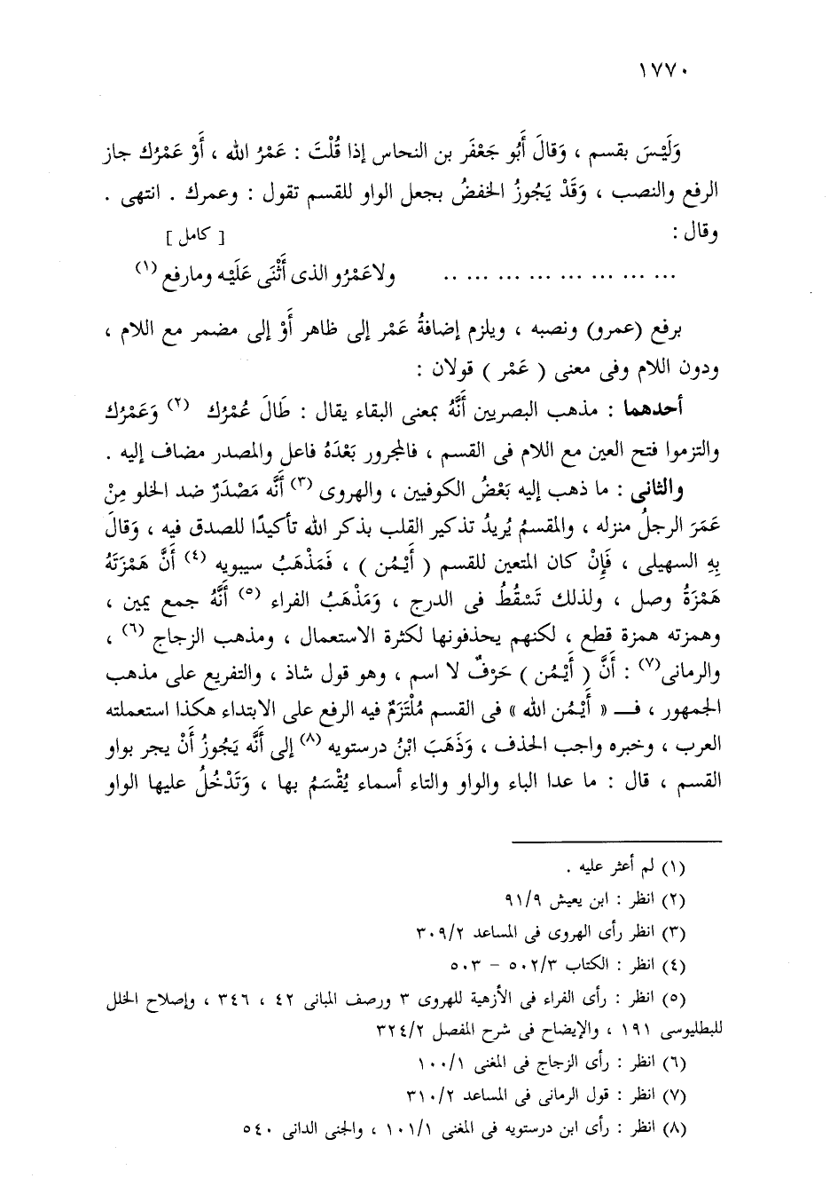 والثاني: ما ذهب إليه بعض الكوفيين، والهروي أنه مصدر ضد الخلو من عمر الرجل منزله، والمقسم يريد تذكير القلب بذكر الله تأكيدًا للصدق فيه، وقال به السهيلي، فإن كان المتعين للقسم (أيمن)، فمذهب سيبويه أن همزته همزة وصل، ولذلك تسقط في الدرج، ومذهب الفراء أنه جمع يمين، وهمزته همزة قطع، لكنهم يحذفونها لكثرة الاستعمال، ومذهب الزجاج، والمراني: أن (أيمن) حرف لا اسم، وهو قول شاذ، والتفريع على مذهب الجمهور، فـ «أيمن الله» في القسم ملتزم فيه الرفع على الابتداء هكذا استعملته العرب، وخبره واجب الحذف، وذهب ابن درستويه إلى أنه يجوز أن يجر بواو القسم، قال: ما عدا الباء والواو والتاء أسماء يقسم بها، وتدخل عليها الواو