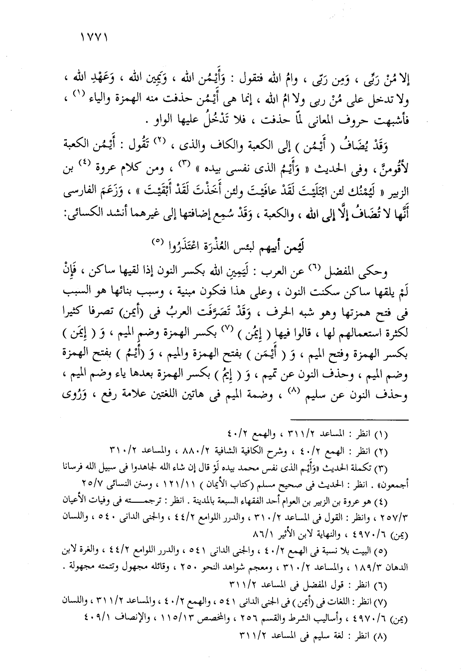 وقد يضاف (أيمن) إلى الكعبة والكاف والذي، تقول: أيمن الكعبة لأقومن، وفي الحديث «وأيم الذي نفسي بيده»، ومن كلام عروة بن الزبير «ليمنك لئن ابتليت لقد عافيت ولئن أخذت لقد أبقيت»، وزعم الفارسي أنها لا تضاف إلا إلى الله، والكعبة، وقد سمع إضافتها إلى غيرهما أنشد الكسائي: