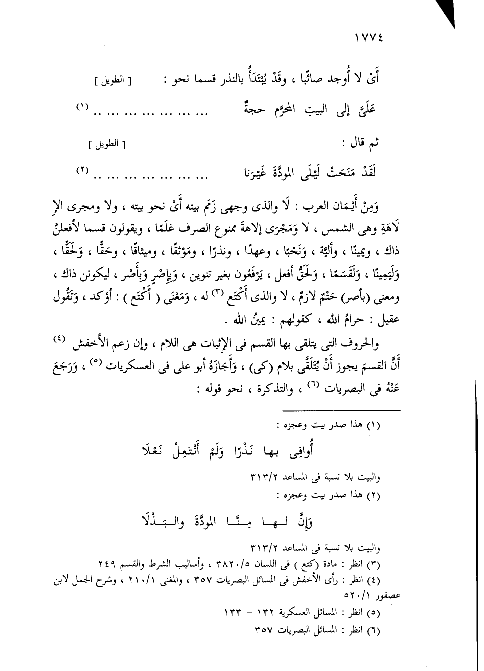 ومن أيمان العرب: لا والذي وجهي زمم بيته أي نحو بيته، ولا ومجرى إلا لاهة وهي الشمس، لا ومجرى إلاهة ممنوع الصرف علمًا، ويقولون قسما لأفعلن ذاك، ويمينًا، وألية، ونحبا، وعهدا، ونذرا، وموثقًا، وميثاقًا، وحقًا، ولحقا، وليمينًا، ولقسمًا، ولحق أفعل، يرفعون بغير تنوين، وبإصر وبأصر، ليكونن ذاك، ومعنى (بأصر) حتم لازم، لا والذي أكتع له، ومعنى (أكتع): أؤكد، وتقول عقيل: حرام الله، كقولهم: يمين الله.