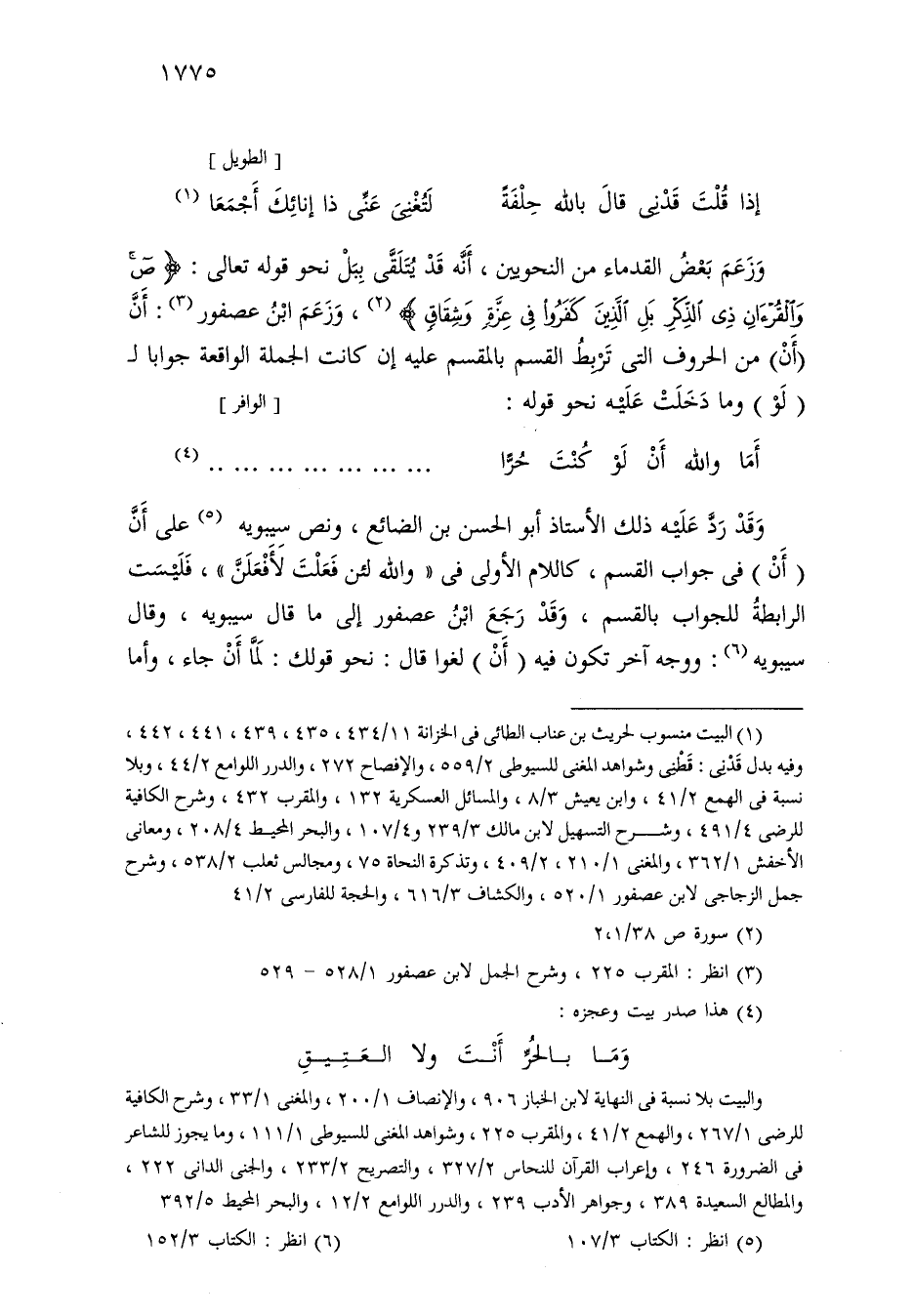 وقد رد عليه ذلك الأستاذ أبو الحسن بن الضائع، ونص سيبويه على أن (أن) في جواب القسم، كاللام الأولى في «والله لئن فعلت لأفعلن»، فليست الرابطة للجواب بالقسم، وقد رجع ابن عصفور إلى ما قال سيبويه، وقال سيبويه: ووجه آخر تكون في (أن) لغوا قال: نحو قولك: لما أن جاء، وأما