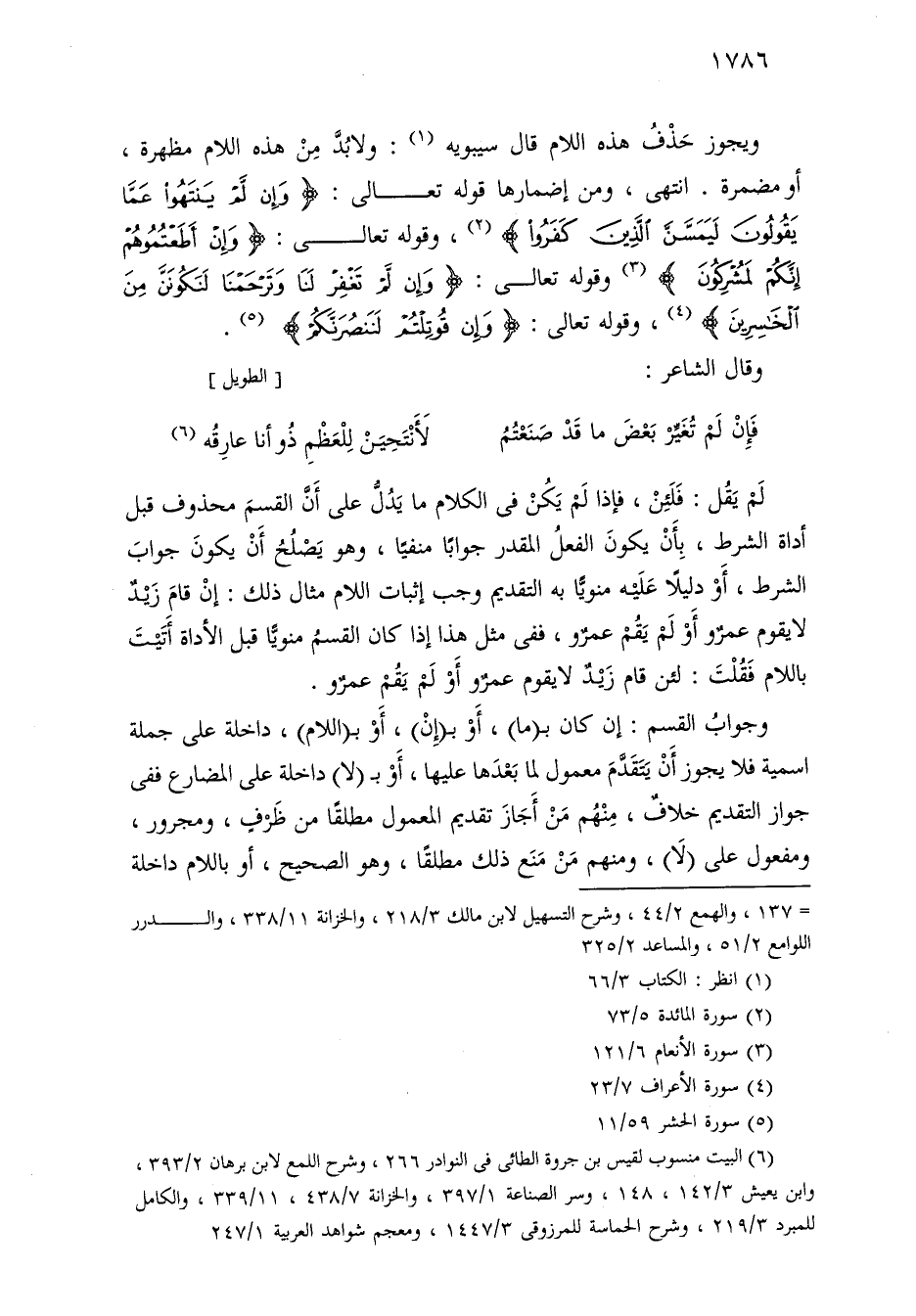 ويجوز حذف هذه اللام قال سيبويه: ولا بد من هذه اللام مظهرة، أو مضمرة. انتهى، ومن إضمارها قوله تعالى: «وإن لم ينتهوا عما يقولون ليمسن الذين كفروا»، وقوله تعالى: «وإن أطعتموهم إنكم لمشركون» وقوله تعالى: «وإن لم تغفر لنا وترحمنا لنكونن من الخاسرين»، وقوله تعالى: «وإن قوتلتم لننصرنكم».
