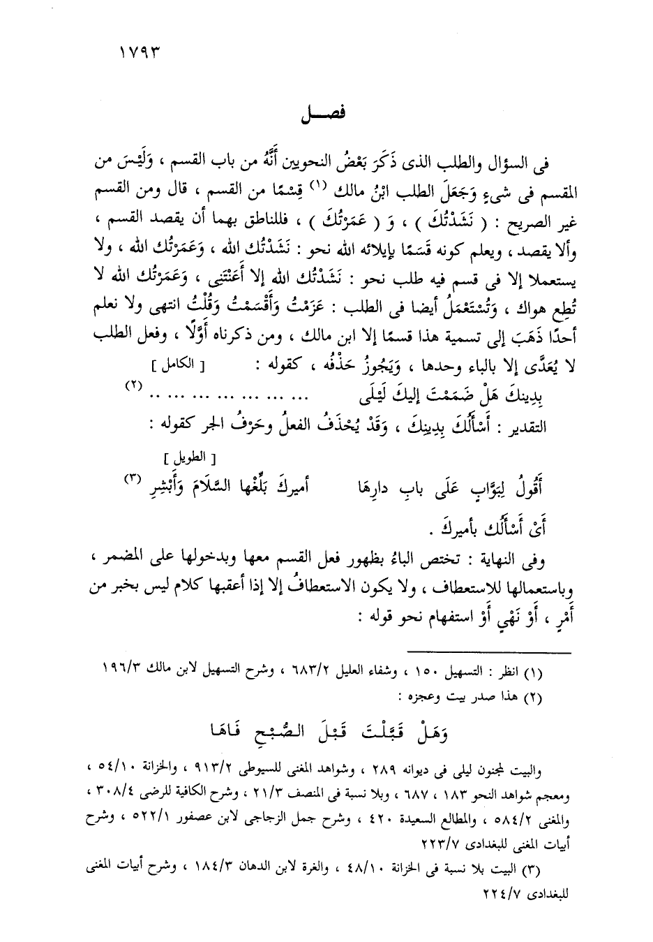 في السؤال والطلب الذي ذكر بعض النحويين أنه من باب القسم، وليس من المقسم في شيء وجعل الطلب ابن مالك قسمًا من القسم، قال ومن القسم غير الصريح: (نشدتك)، و (عمرتك)، فللناطق بهما أن يقصد القسم، وألا يقصد، ويعلم كونه قسمًا بإيلائه الله نحو: نشدتك الله، وعمرتك الله، ولا يستعملا إلا في قسم فيه طلب نحو: نشدتك الله إلا أعنتني، وعمرتك الله لا تطع هواك، وتستعمل أيضًا في الطلب: عزمت وأقسمت وقلت انتهى ولا نعلم أحدًا ذهب إلى تسمية هذا قسمًا إلا ابن مالك، ومن ذكرناه أولاً، وفعل الطلب لا يعدى إلا بالباء وحدها، ويجوز حذفه، كقوله: