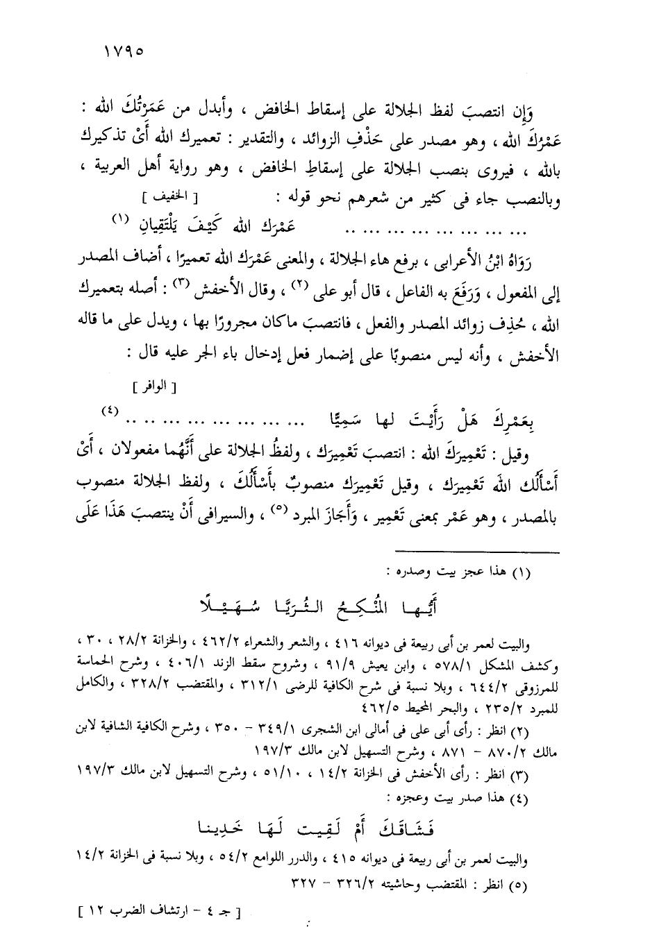 وإن انتصب لفظ الجلالة على إسقاط الخافض، وأبدل من عمرتك الله: عمرك الله، وهو مصدر على حذف الزوائد، والتقدير: تعميرك الله أي تذكيرك بالله، فيروى بنصب الجلالة على إسقاط الخافض، وهو رواية أهل العربية، وبالنصب جاء في كثير من شعرهم نحو قوله:
