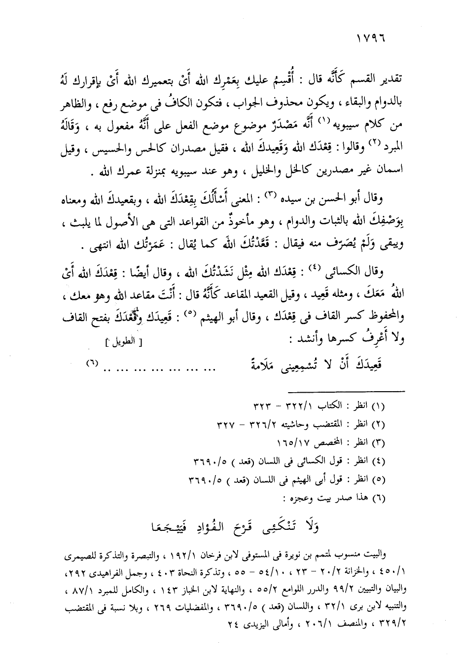 وقال أبو الحسن بن سيده: المعنى أسألك بقعدك الله، وبقعيدك الله ومعناه بوصفك الله بالثبات والدوام، وهو مأخوذ من القواعد التي هي الأصول لما يلبث، ويبقى ولم يصرف منه فيقال: قعدتك الله كما يقال: عمرتك الله انتهى.
