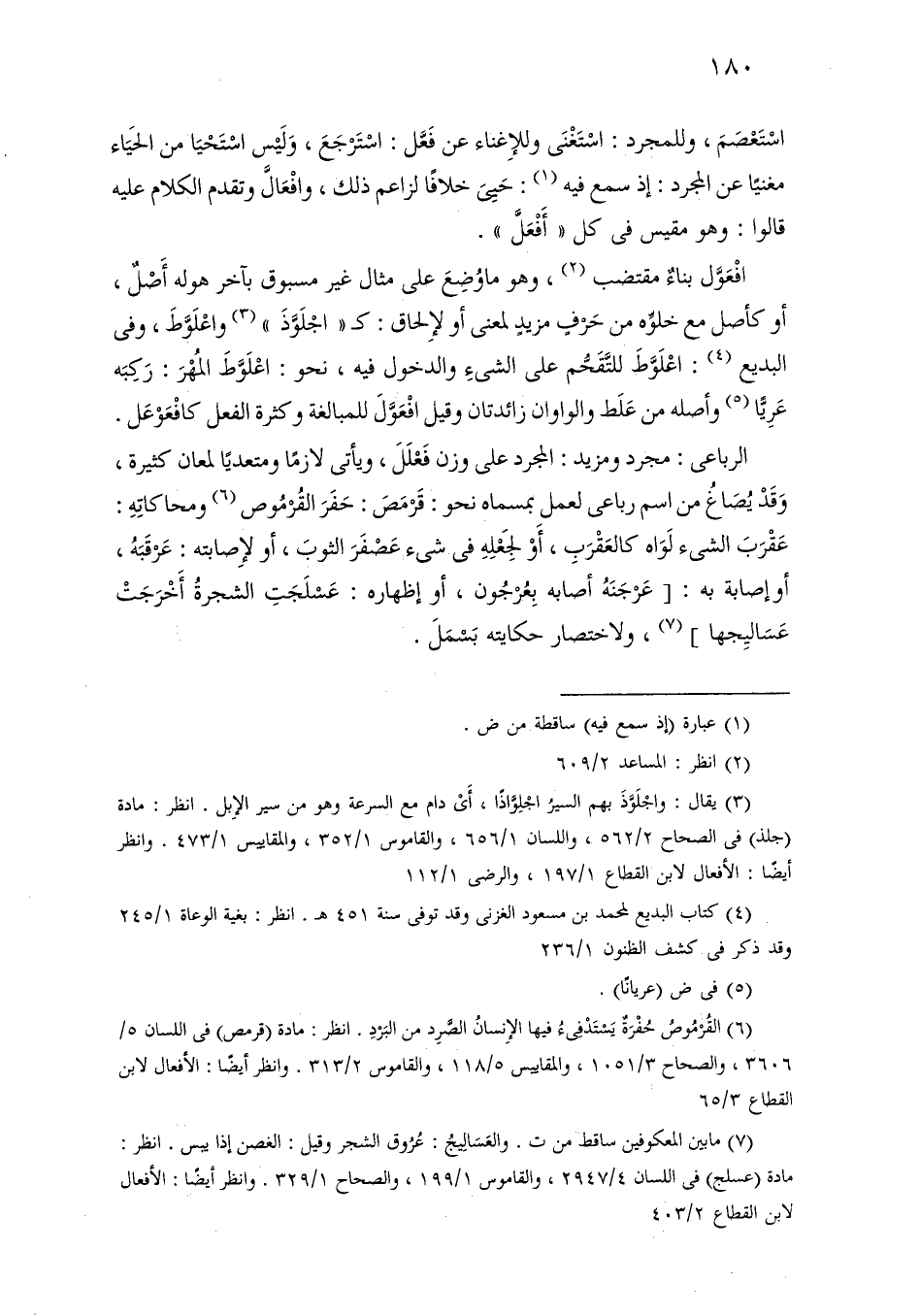 الرباعي: مجرد ومزيد: المجرد على وزن فعلل، ويأتي لازمًا ومتعديًا لمعان كثيرة، وقدي صاغ من اسم رباعي لعمل بمسماه نحو: قرمص: حفر القرموص ومحاكاته: عقرب الشيء لواه كالعقرب، أو لجعله في شيء عصفر الثوب، أو لإصابته: عرقبه، أو إصابة به: [عرجنه أصابه بعرجون، أو إظهاره: عسلجت الشجرة أخرجت عساليجها]، ولاختصار حكايته بسمل.