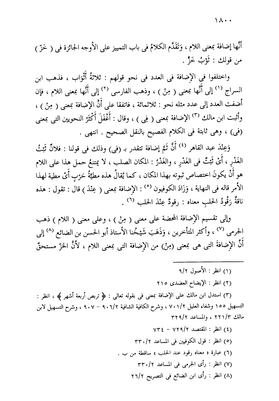 واختلفوا في الإضافة في العدد في نحو قولهم: ثلاثة أثواب، فذهب ابن السراج إلى أنها بمعنى (من)، وذهب الفارسي إلى أنها بمعنى اللام، فإن أضفت العدد إلى عدد مثله نحو: ثلاثمائة، فاتفقا على أن الإضافة بمعنى (من)، وأثبت ابن مالك الإضافة بمعنى (في)، وقال: أغفل أكثر النحويين التي بمعنى (في)، وهي ثابتة في الكلام الفصيح بالنقل الصحيح. انتهى.