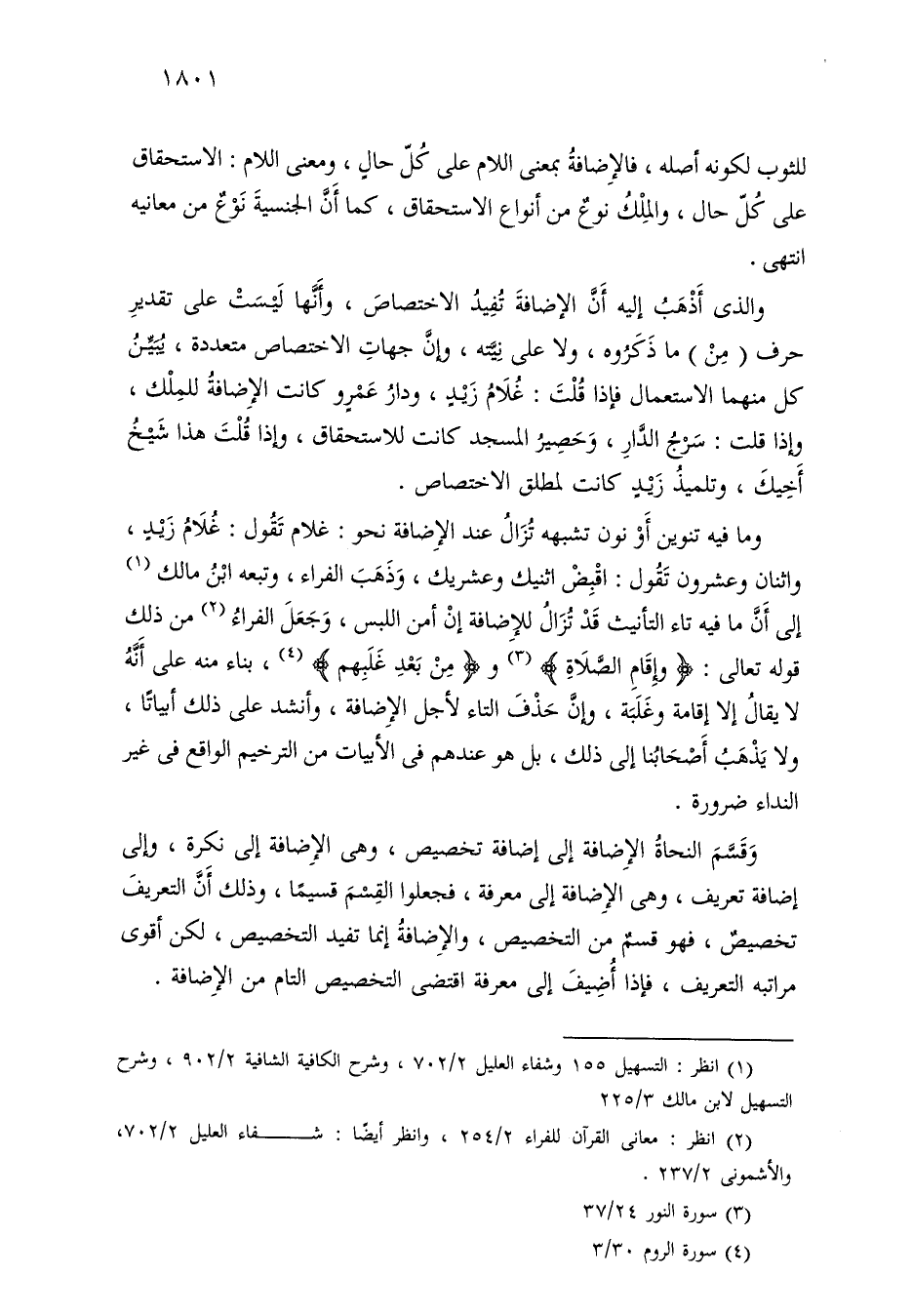 والذي أذهب إليه أن الإضافة تفيد الاختصاص، وأنها ليست على تقدير حرف (من) ما ذكروه، ولا على نيته، وإن جهات الاختصاص متعددة، يبين كل منهما الاستعمال فإذا قلت: غلام زيد، ودار عمرو كانت الإضافة للملك، وإذا قلت: سرج الدار، وحصير المسجد كانت للاستحقاق، وإذا قلت هذا شيخ أخيك، وتلميذ زيد كانت لمطلق الاختصاص.