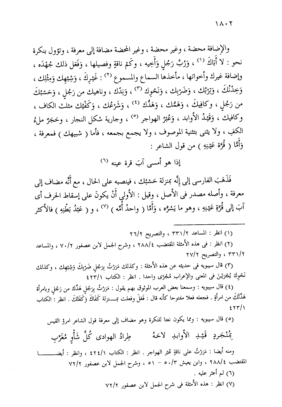 والإضافة محضة، غير محضة، وغير المحضة مضافة إلى معرفة، وتؤول بنكرة نحو: لا أباك، ورب رجل وأخيه، وكم ناقة وفصيلها، وفعل ذلك جهده، وإضافة غيرك وأخواتها، مأخذها السماع والمسموع: غيرك، وشبهك ومثلك، وخدنك، وتربك، وضربك، ونحوك، وندك، وناهيك من رجل، وحسبك من رجل، وكافيك، وهمك، وهدك، وشرعك، وكفيك مثلث الكاف، وكافيك، وقيد الأوابد، وعبر الهواجر، وجارية شكل النجار، وحجر ملء الكف، ولا يثنى بتثنية الموصوف، ولا يجمع بجعه، فأما (شبيهك) فمعرفة، وأما (قرة عينه) من قول الشاعر: