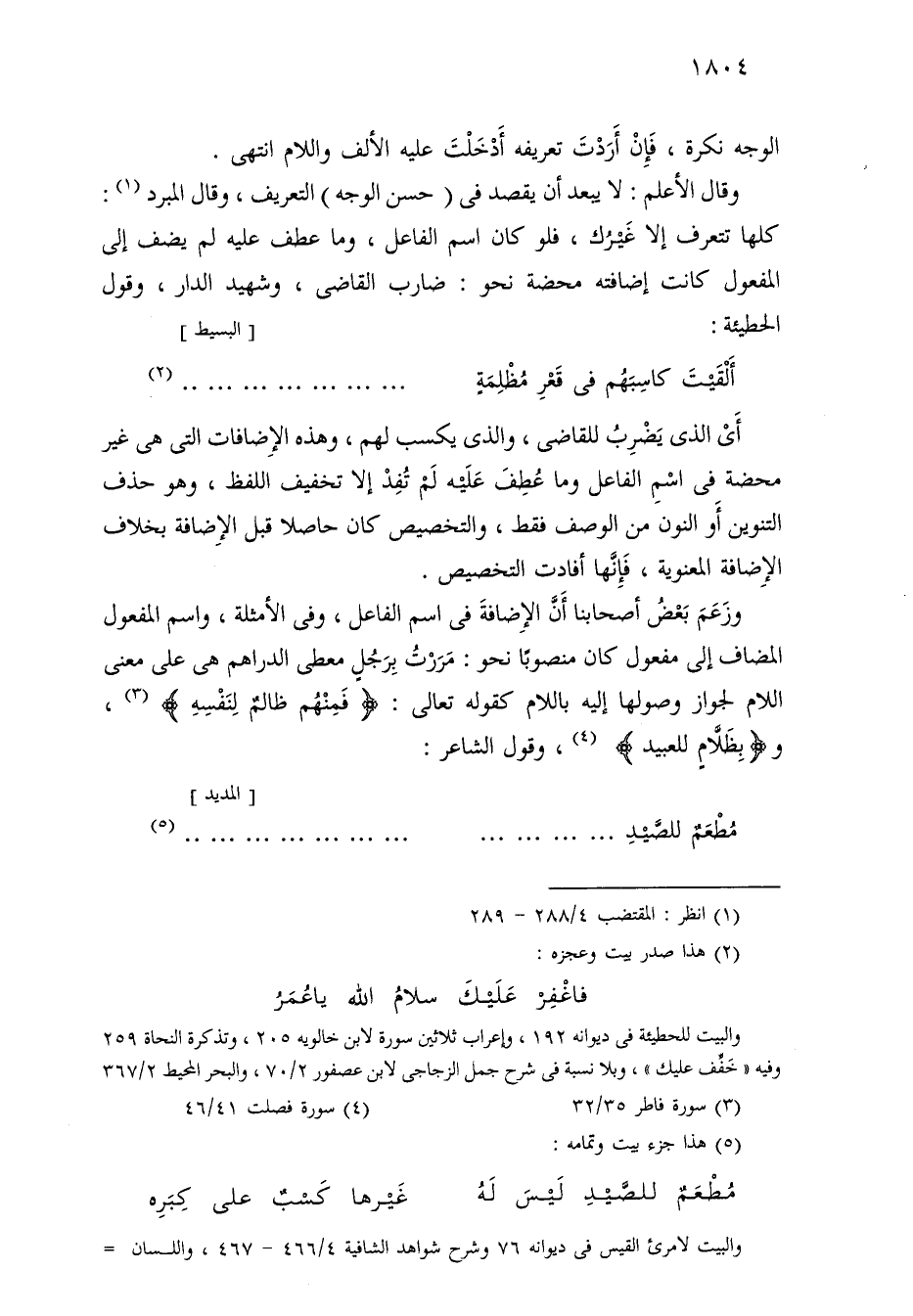 وقال الأعلم: لا يبعد أن يقصد في (حسن الوجه) التعريف، وقال المبرد: كلها تتعرف إلا غيرك، فلو كان اسم الفاعل، وما عطف عليه لم يضف إلى المفعول كانت إضافته محضة نحو: ضارب القاضي، وشهيد الدار، وقول الحطيئة:
