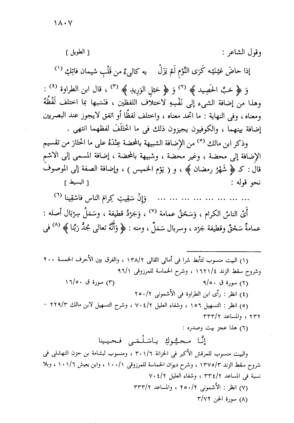 و «حب الحصيد» و «حبل الوريد»، قال ابن الطراوة: وهذا من إضافة الشيء إلى نفسه لاختلاف اللفظين، فنسبها بما اختلف لفظه ومعناه، وفي النهاية: ما اتحد معناه، واختلف لفظًا أو اتفق لا يجوز عند البصريين إضافة بينهما، والكوفيون يجيزون ذلك في ما اختلف لفظهما انتهى.