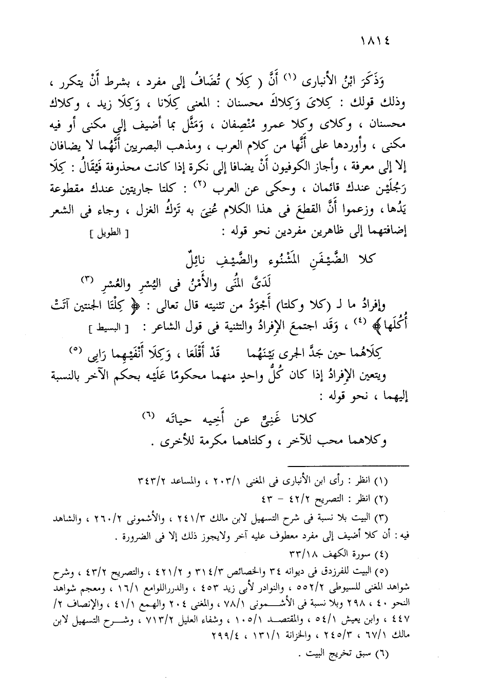 وإفراد ما لـ (كلا وكلتا) أجود من تثنيته قال تعالى: «كلتا الجنتين آتت أكلها»، وقد اجتمع الإفراد والتثنية في قول الشاعر: